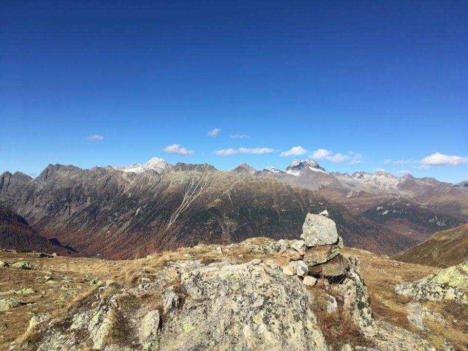 Herbstwanderung durch goldenen Lärchenwald auf den berühmten Aussichtsberg, T3. Start Gravatscha 8.45 Uhr, minus 1 Grad, windstill. Im Wald noch teilweise nass und rutschig, ab Waldgrenze trocken und ab 2400 m Sonne. Bin dann ab Höhe 2380 weglos via Plaun dals Müls direkt zum flachen Gipfel Höhe 2569 m gewandert. Die Bergstation befindet sich weiter unten auf Höhe 2456 m und hat bis zur Wintersaison den Betrieb eingestellt. Grandiose Aussicht in alle Richtungen, kein Mensch weit und breit. Abstieg wie Aufstieg mit Sonne bis zum Wald.