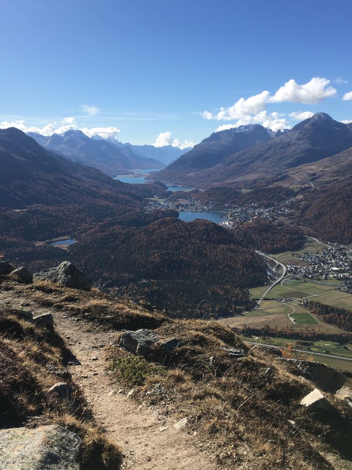 Im Abstieg in der Westflanke hoch über Samedan vier Wanderer im Aufstieg