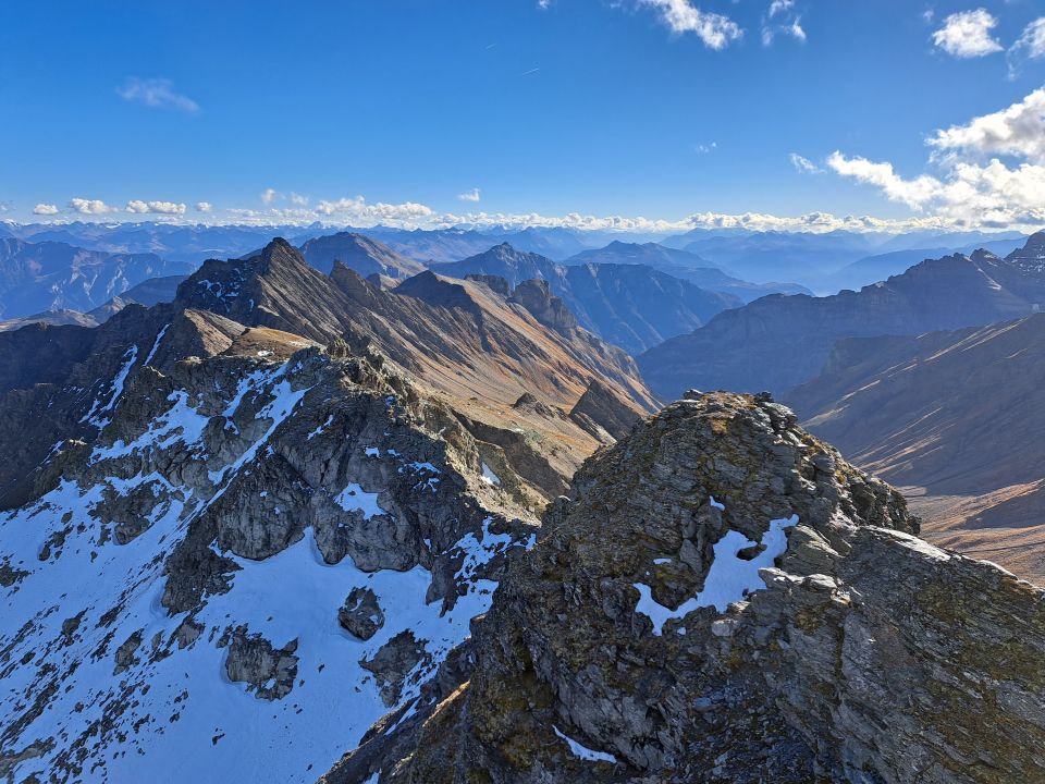 Gipfelschlussaufstieg ab Pizollücke sonnseitig trocken und schneefrei und gut mit Seilen gesichert.