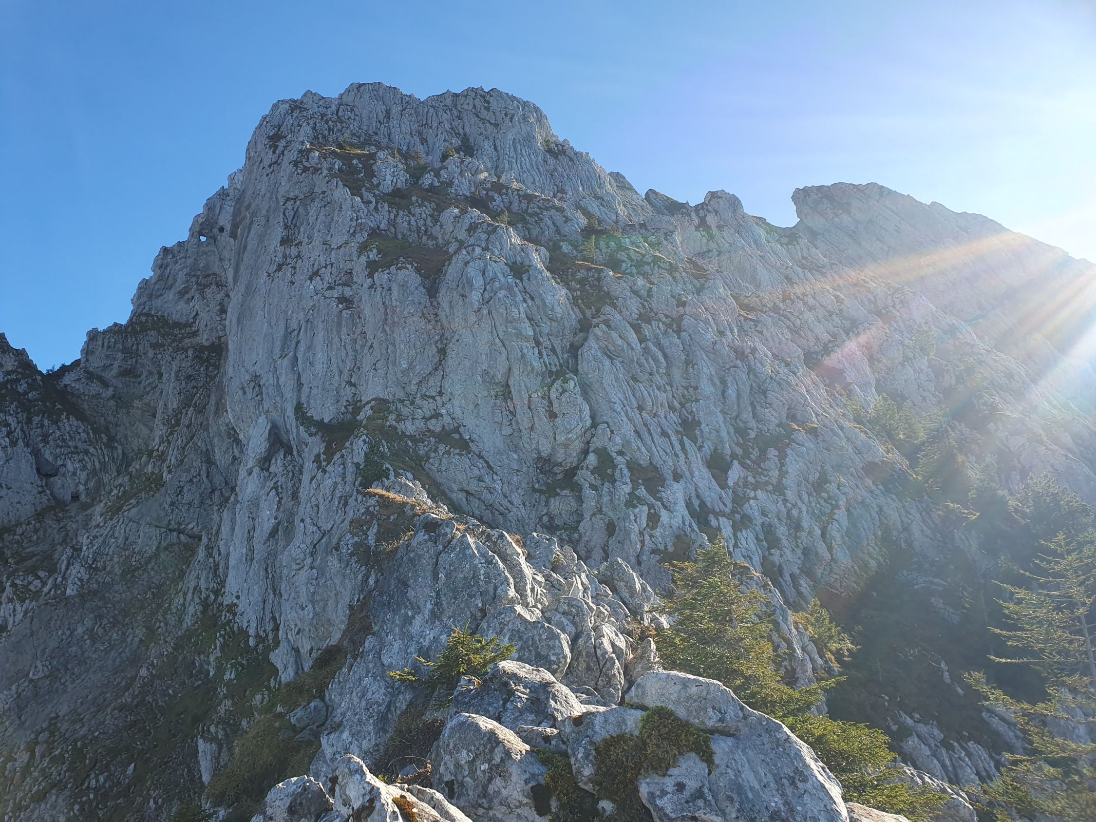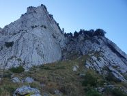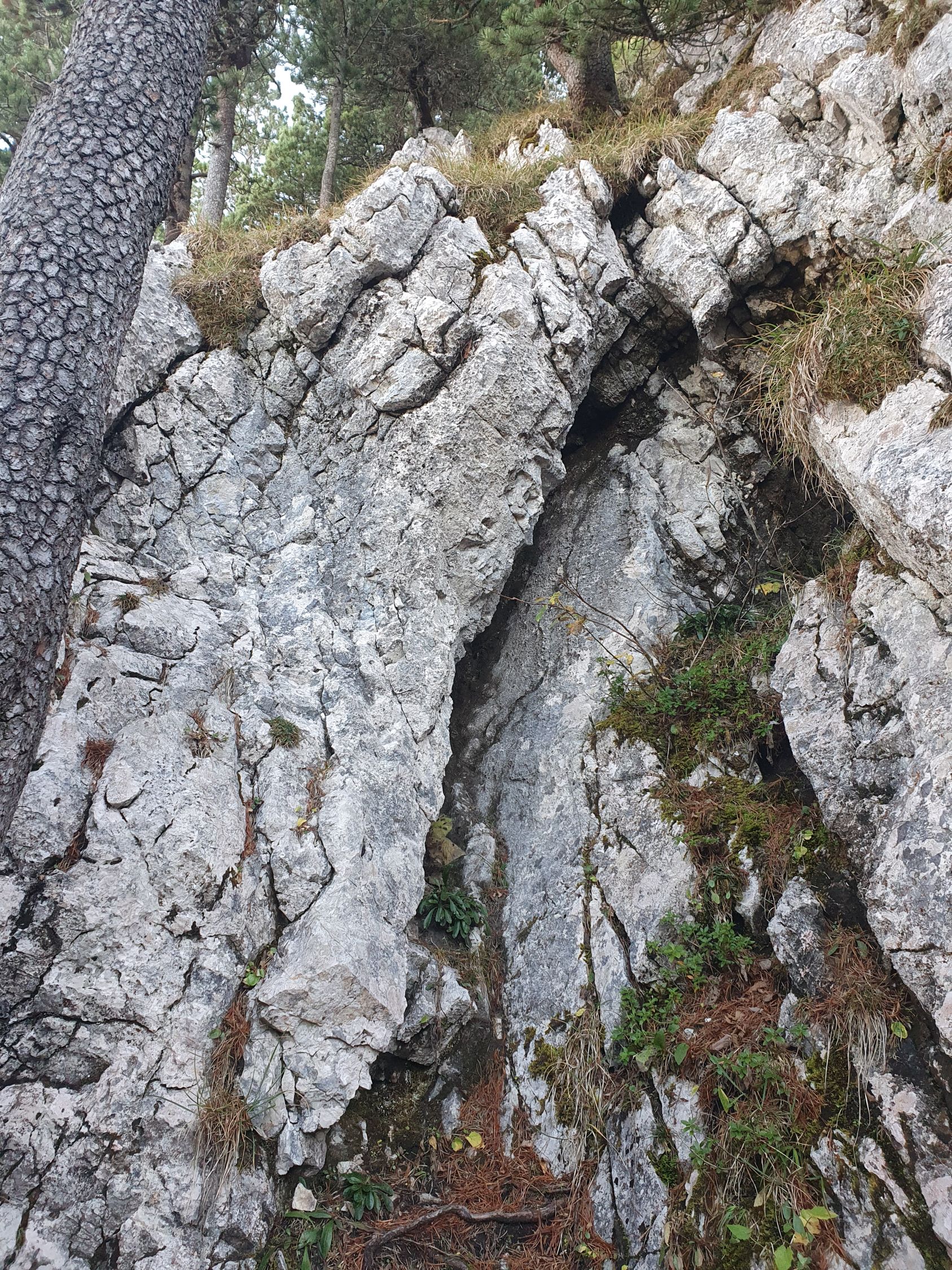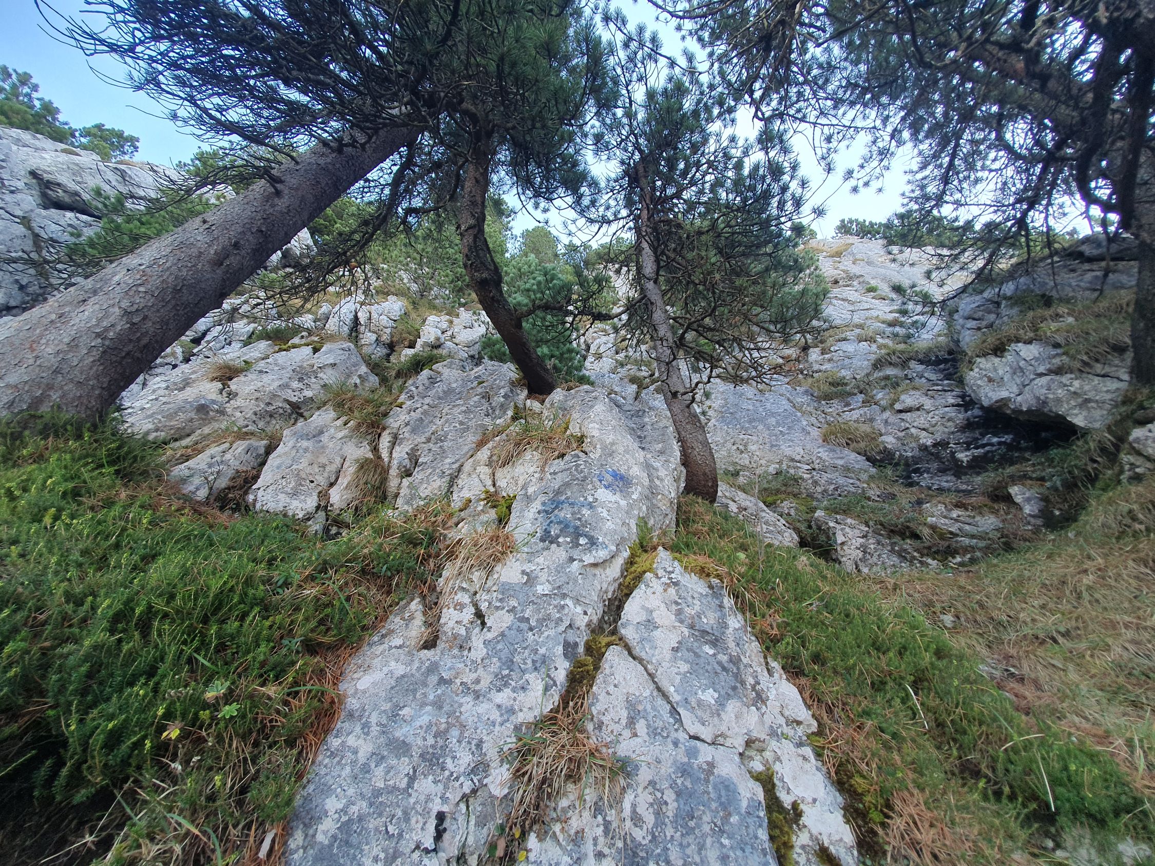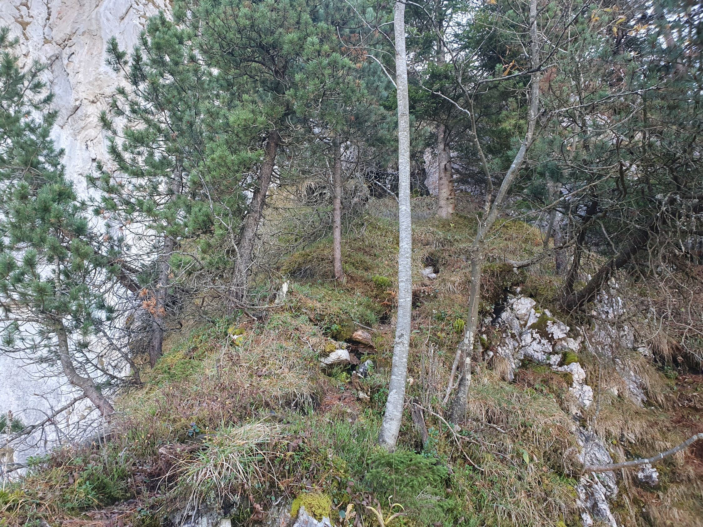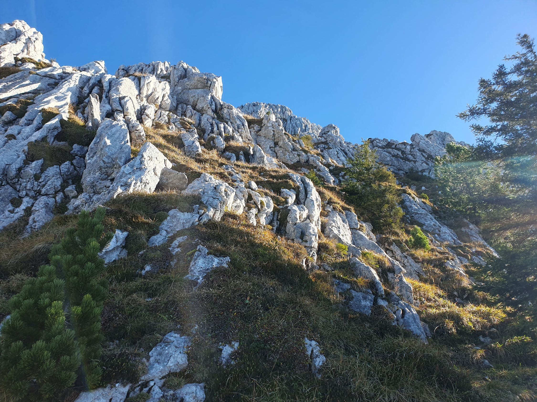 Kurzes Kraxel- wechselt sich mit exponiertem Gehgelände ab. Dank den Föhren fällt einem beim Aufstieg gar nicht so auf, dass man da doch ziemlich stark exponiert hochsteigt. Mal zieht man sich an den Felsen, dann an den Föhren oder an den Wurzeln und wenn nichts da ist, was nicht der Fall war, dann halt am Gras. Zum Glück war da alles ziemlich trocken, so, dass der Aufstieg auch ein Genuss sein konnte. Bis hier wohl ein T6, II.
