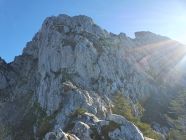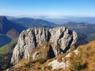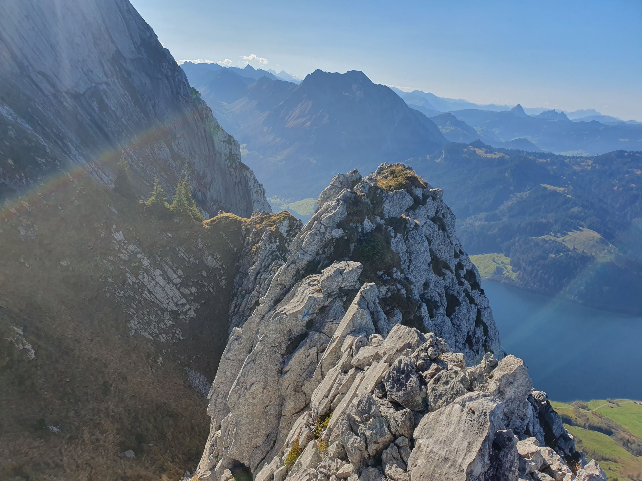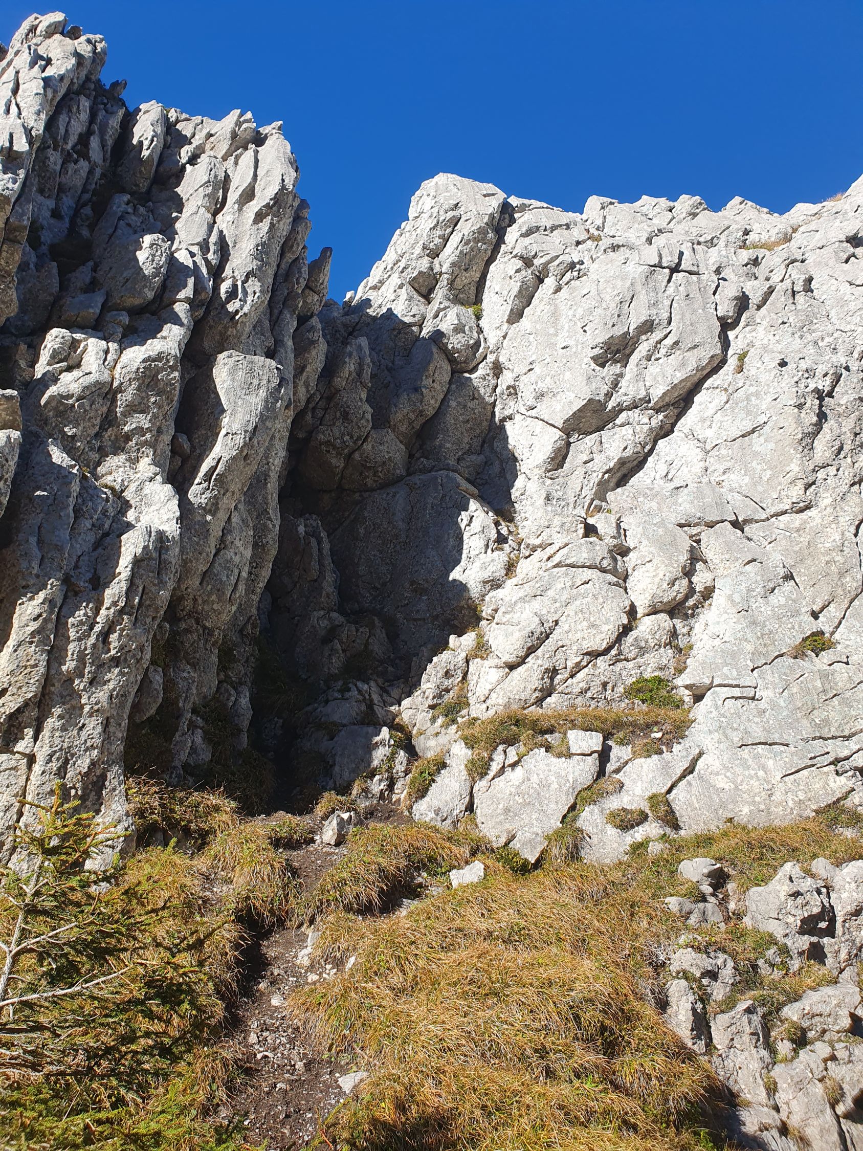 Die erste kurze Schlüsselstelle ist wohl ein Kamin (unten weist ein blauer Pfeil den Weg), der hochgeklettert werden möchte (T6, II+). Oben angekommen wird es auch klar, warum diese Route nicht in Umgekehrter Richtung empfehlenswert ist. Ab da geht es auf abwechslungsreichem Terrain spannend weiter bis zu P1866. Hier kommt nun die zweite und letzte Schlüsselstelle dieser Tour; eine rund 10 Meter senkrechte Wand, die etwas mehr Handeinsatz braucht (T6, III). Ein blauer Pfeil weist den Einstieg. Ein Abseilring wäre hier für das Abseilen installiert. Dank einer vorhandenen Schlinge mit einem kurzen Seil (könnte etwas länger sein), der rund einen Meter unter den oberen Felsen liegt, kann diese Stelle jedoch problemlos ohne Abseilen abgeklettert werden. Es braucht wohl für die Meisten zuoberst ein wenig Überwindung, da mal zuerst nur mit den Händen, und schlecht mit den Füssen Halt bis zum Seil finden kann. Sobald man das Seil in den Händen hat ist der Rest schon gemacht...