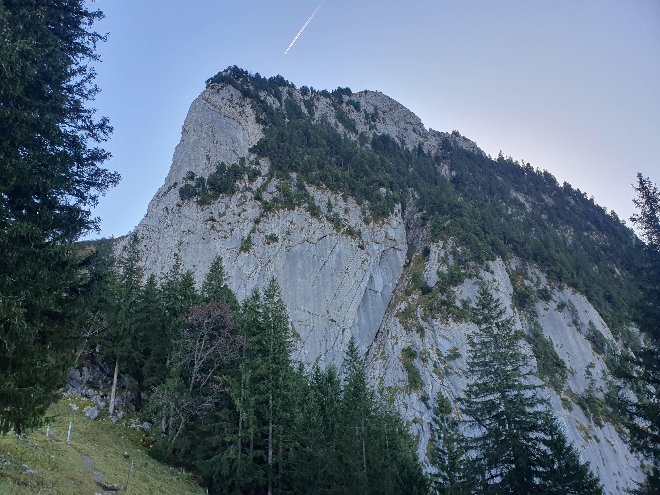 Zuerst unspektakulär auf der geteerten Strasse hoch und erst bei Gwürzwald (P1104) auf dem etwas feuchten und schlammigen Wanderweg via Schwarzenegg zur Bockmattlihütte. Die Gedanken kreisten sich beim Aufstieg darin, ob es heute doch zu feucht für diese etwas exponierte Tour sei? Schliesslich bewegt man sich bei dieser Tour laut älteren Berichte nicht nur auf Felsen, sondern meist auch auf grasigem und bewachsenem Terrain mit Föhren, d.h. auch mit vielen Wurzeln...