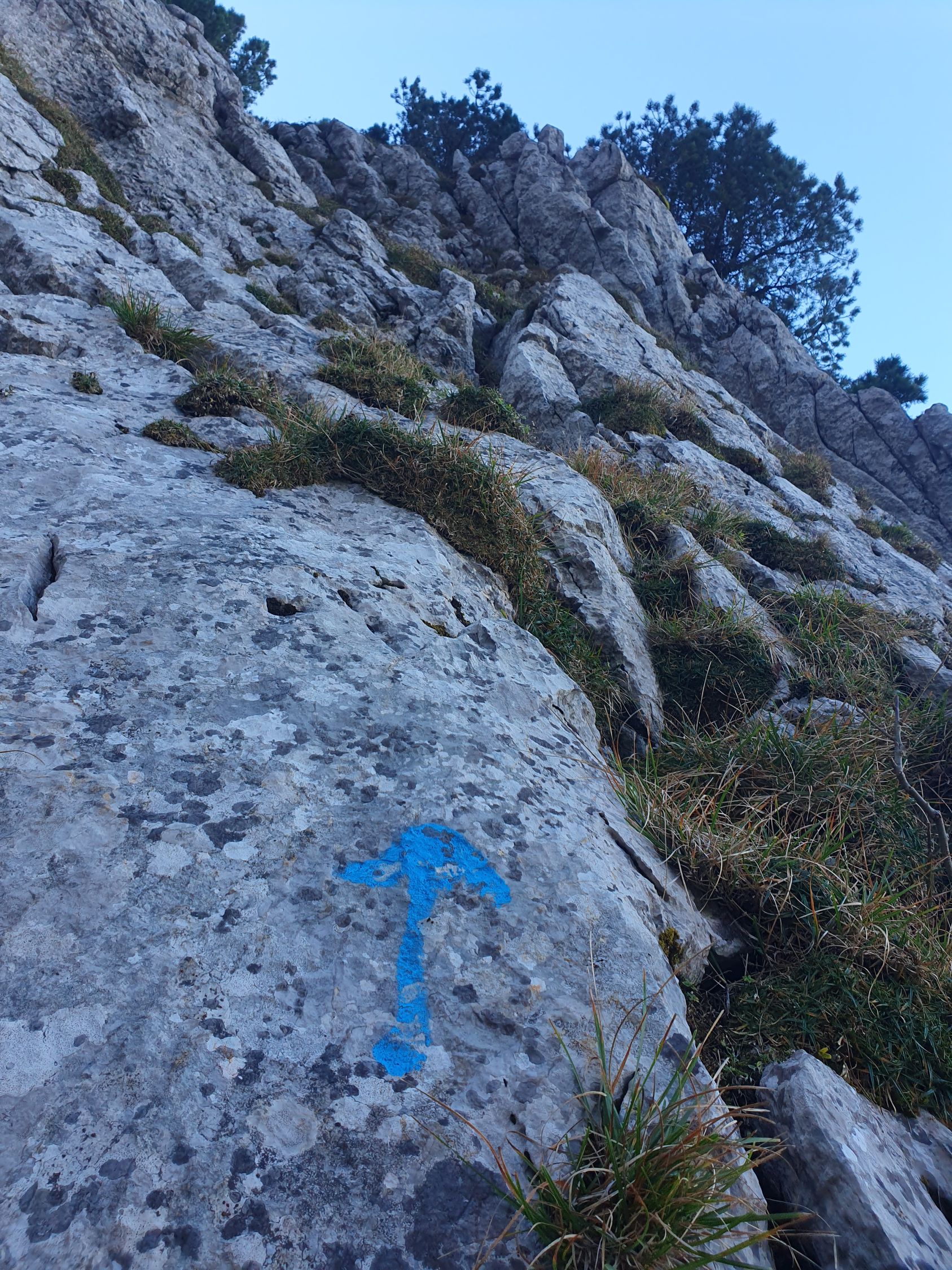 Mit der Einstellung "ich gehe mal gucken" ging es gleich ein paar Meter nach der Bockmattlihütte, die geschlossen war, schon los. Ein kleiner steiler Pfad ist da erkennbar (leider keine blaue Markierung für den Einstieg gesichtet), weiter oben auch eine Stahlkette zwischen zwei Felsen (für was die echt gut ist?). Dank den trockenen Felsen ging es, trotz etwas feuchtem Gras, bereits anfangs etwas exponiert, hoch zu den Föhren. Hier unterwegs ein blauer Pfeil gesichtet, so, dass nun ganz sicher auf der richtigen Route lag.