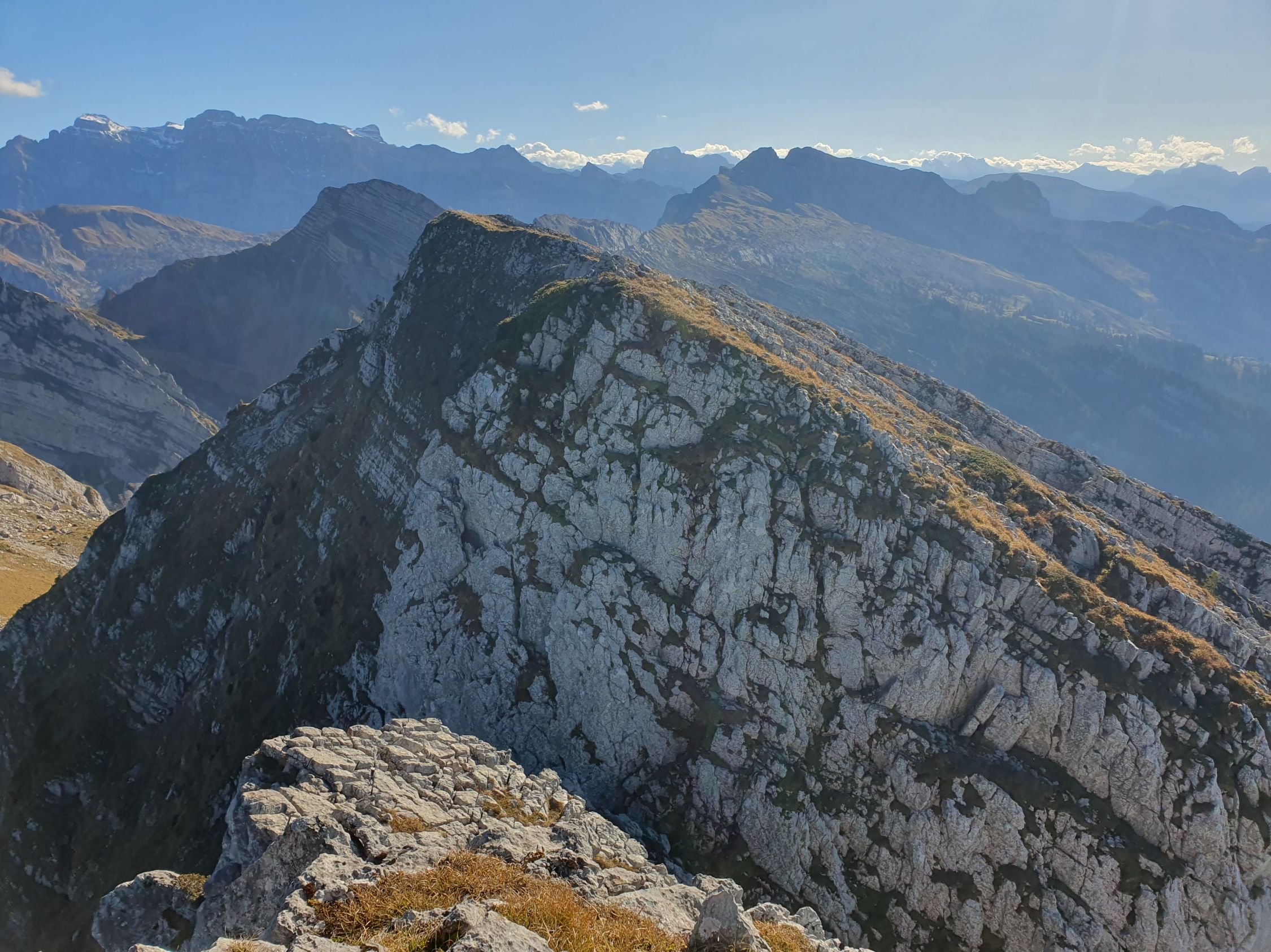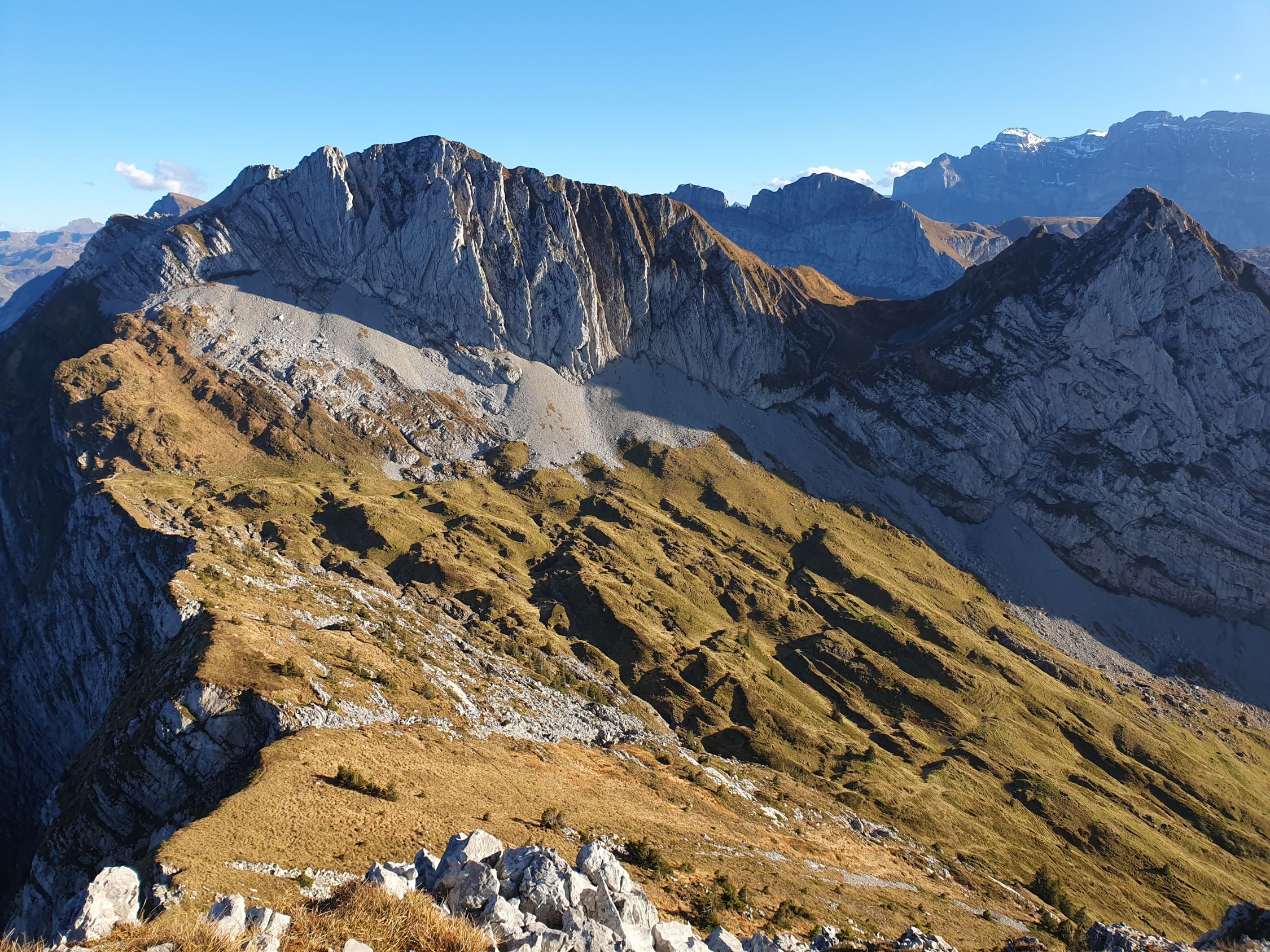 Weiter ging es nach Osten auf dem Grat bis zu einem Felsabschwung, der südlich etwas ausgesetzt umgangen wird (T4+), danach ab P1987 direkt auf dem Grat hianb zum Chammli (P1903), Imposant ist der Rückblick von hier zur senkrechten Wand nach Norden hinab.