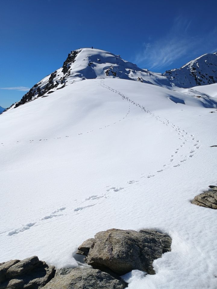 Bin normal hoch, nicht via Chli und Gross Chastelhorn. Tagestour ab Münster. Bis Chastellücke alles furztrocken. Danach zum See kurz ein paar Blöcke mit Raureif. Aufpassen. Dann wider trocken bis auf den Grat der von P. 2954 runter zieht. Dann schöner Trittschnee bis zum Gipfel. An Schattenlagen ziemlich fluffig. Deshalb nur bis Heji Zwächte, der Grat zum Firehorn ist winterlich.