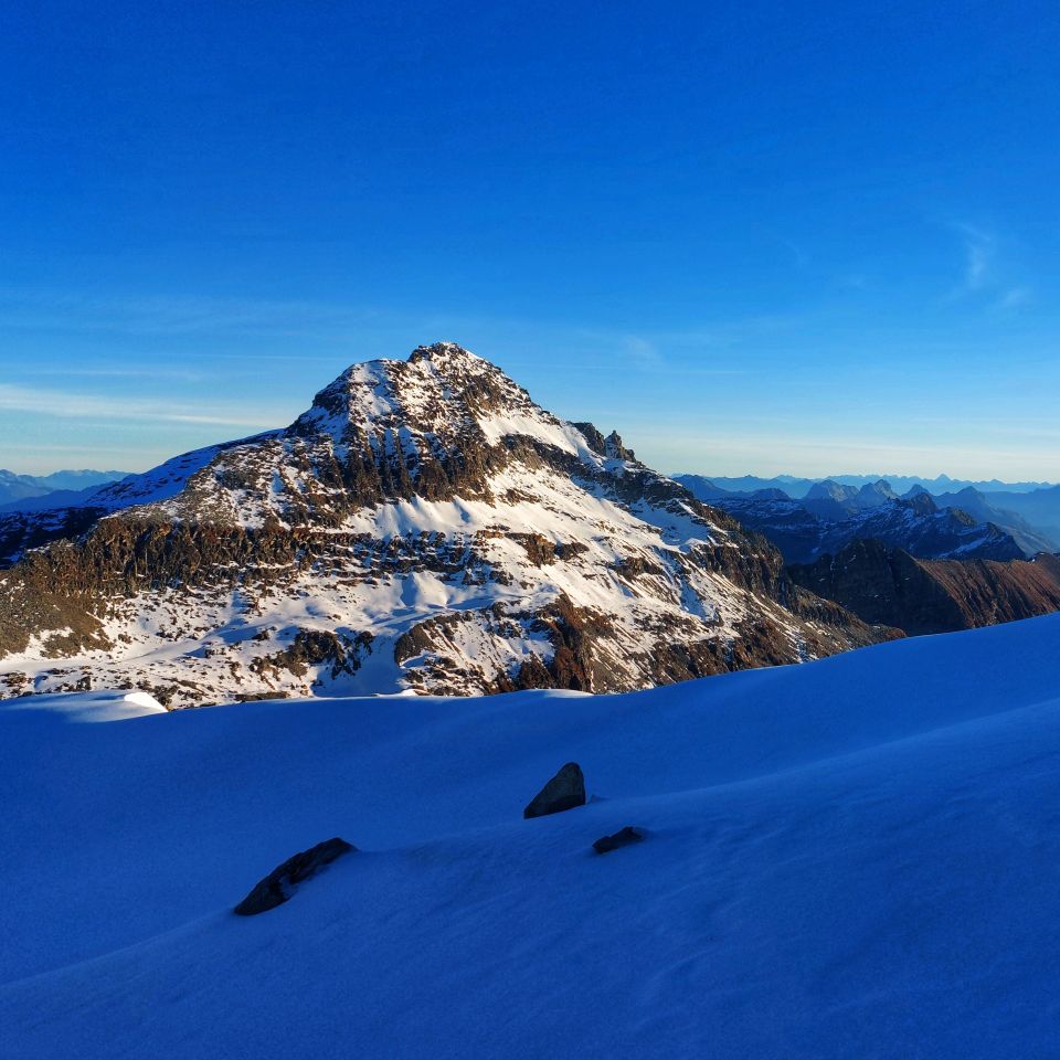 Von der Läntahütte den Talboden hinein dem markierten Weg entlang bis 2500m. Hier auf Steigeisen hoch bis an den Wandfuss. Hier Querung die Bänder hoch Richtung Läntagletscher. Einige Steinmänner weisen den Weg um möglichst links haltend auf den Gletscher zu gelangen. Die Bilder von Juli 22 illustrieren den Wegverlauf perfekt. Ab 2800 geschlosse Schneedecke, hart und perfekt zugehen, ab 3100 dann ein unangenehmer Deckel der durchbricht bis zum Gipfel. Herrliche Fernsicht und mil. Abstieg dann zur Lentalücke und dem Westgrat folgen auf das Güferhorn. Grat teils schneefrei, ab 3200 beim aufsteilenden Grat in der Flanke guter Trittschnee die letzten Türme im Schnee erklettert. Abstieg über den Güfergletscher, bei der ersten Felsinsel links haltend weiter bis an den Rand der Steilstufe. Hier ganz links den Gletscherresten nach grade runter oder etwas weiter östlich wieder leicht nach links querend zum Einstieg in die unter Güferlücke auf 2760m. Hier ein gerölliges Schuttband hoch in die Lücke, Ausstieg besser links in den bräunlich rötlichen als in den hellgrauen Felsen. Runter in den rötlichen Felsen (Steinmänner), nach dem Seelein rechts haltend zum Wanderweg und runter zur Läntahütte. Aufstieg aufs Rheinwaldhorn in sportlichen 3:45, nach 6:00 auf dem Güferhorn und nach 9:00 Stunden wieder am Ausgangspunkt. Thomas Meier hat uns toll bewirtet und informiert, nun ist die Hütte geschlossen