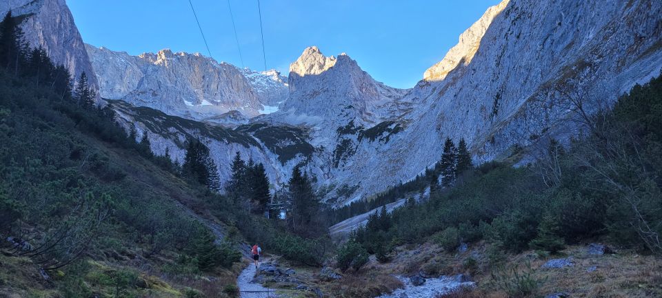 Abstieg durch den Stopselzieher. Die ersten 200Hm im Abstieg geschlossene Schneedecke. (Im Schatten hart gefroren). Der Stopselzieher wurde am 1.11.24 von mehr Personen im Aufstieg begangen als der Aufstieg durchs Höllental.