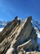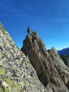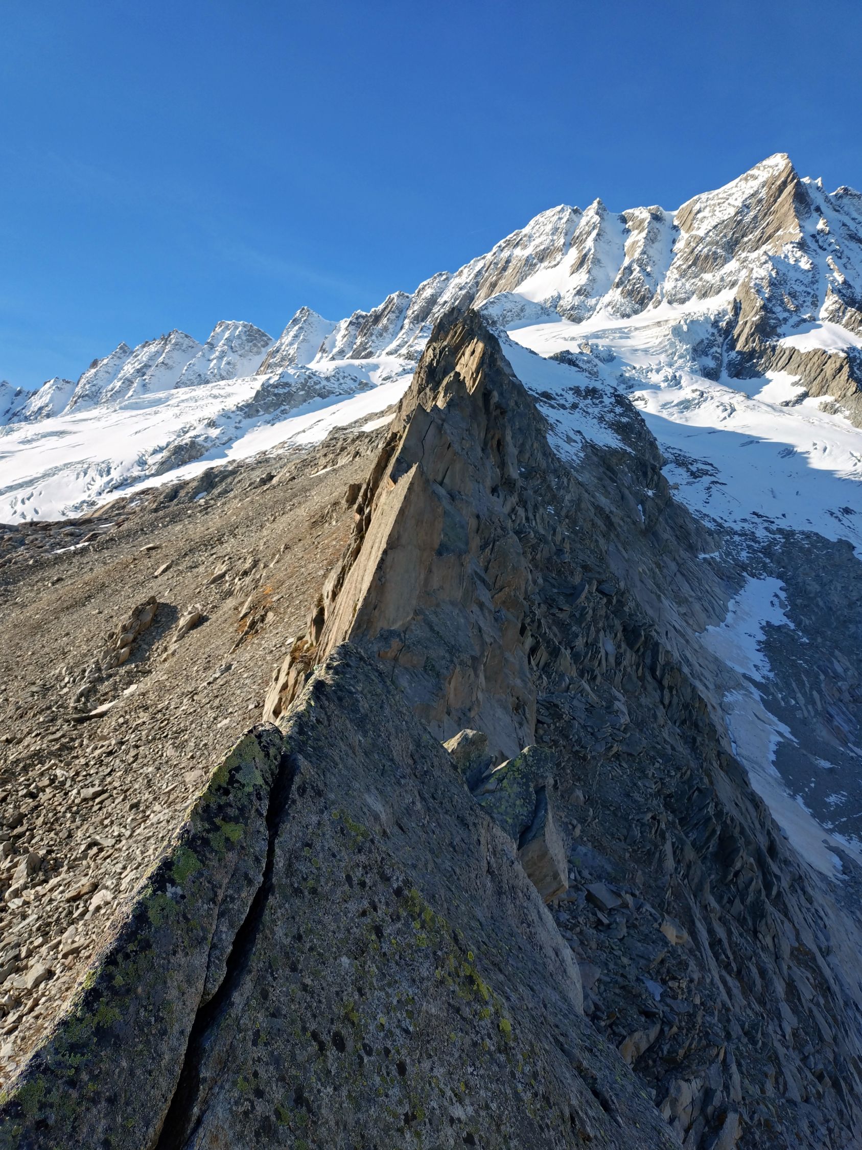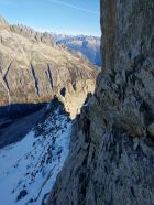 Während der erste Abschnitt bis zur Zwischenausstiegsscharte in gutmütigem Gelände zügig absolviert werden kann (klare Linie, immer wieder BH), wird es im zweiten Teil deutlich wilder. Die Kletterei wird schwieriger, es hat kaum noch fixes Sicherungsmaterial, die Routenfindung wird etwas anspruchsvoller (wenn auch nicht wirklich schwierig) und die Felsqualität lässt etwas nach (ist aber nach wie vor ganz passabel). Unsere Zeiten als Orientierung zum Vergleich: Unterer Teil: 1h 20, oberer Teil: 3h 40. Man ist also nach dem unteren Teil noch nicht in der Hälfte. Insbesondere der oberste Teil von der Scharte (einfacher Zwischenausstieg nach Süden) bis zum Ausstieg zieht sich und ist unseres Erachtens im Bereich des sehr schmalen Grates schwieriger als im Topo angegeben und stellenweise schwierig abzusichern. Diese Bereich können aber auf einen schwach ausgeprägten und leicht ansteigenden Band auf der Nordseite, wenige Meter unterhalb des Grates etwas einfacher und vor allem mit Friends besser absicherbar erklettert werden.