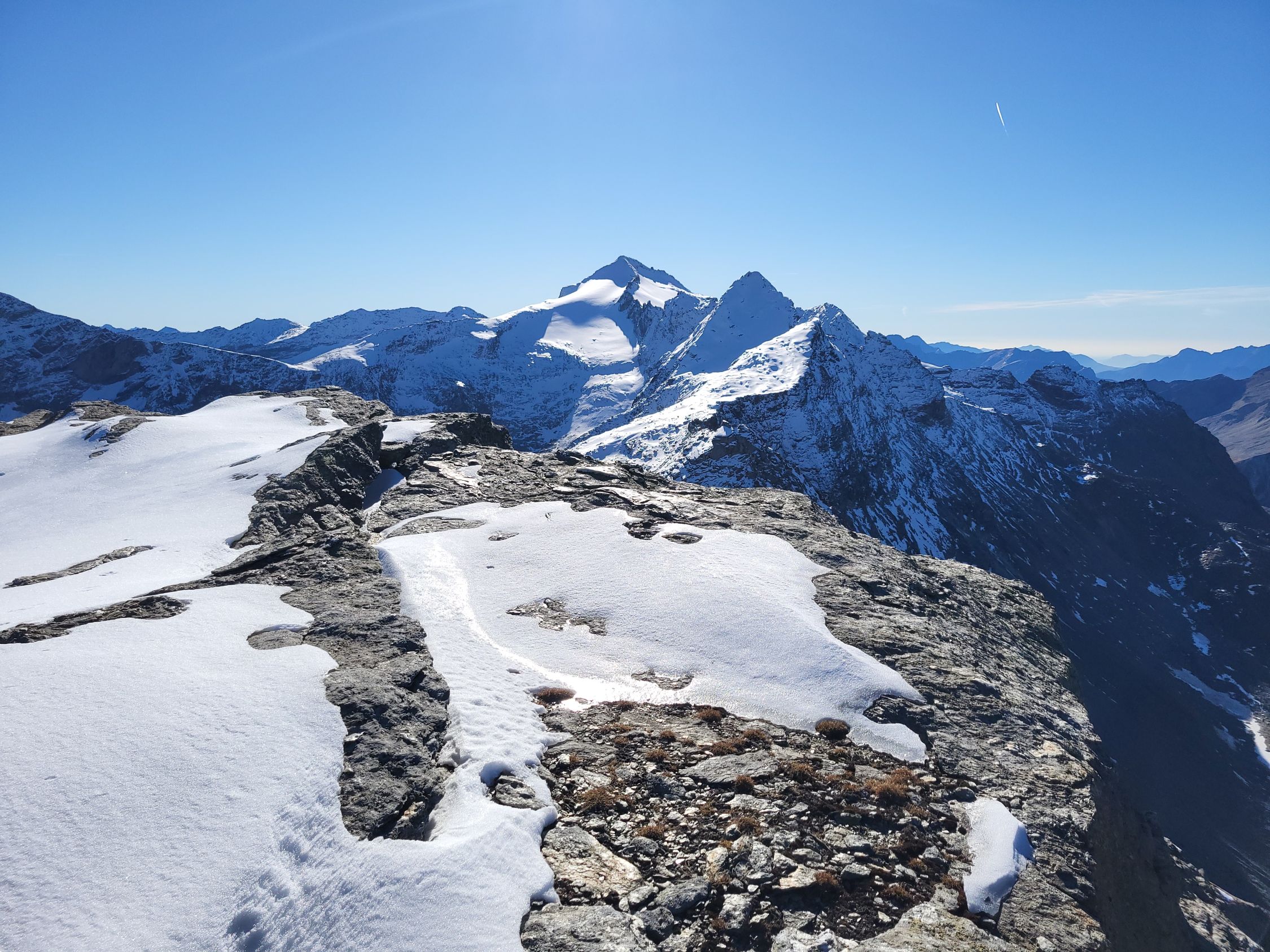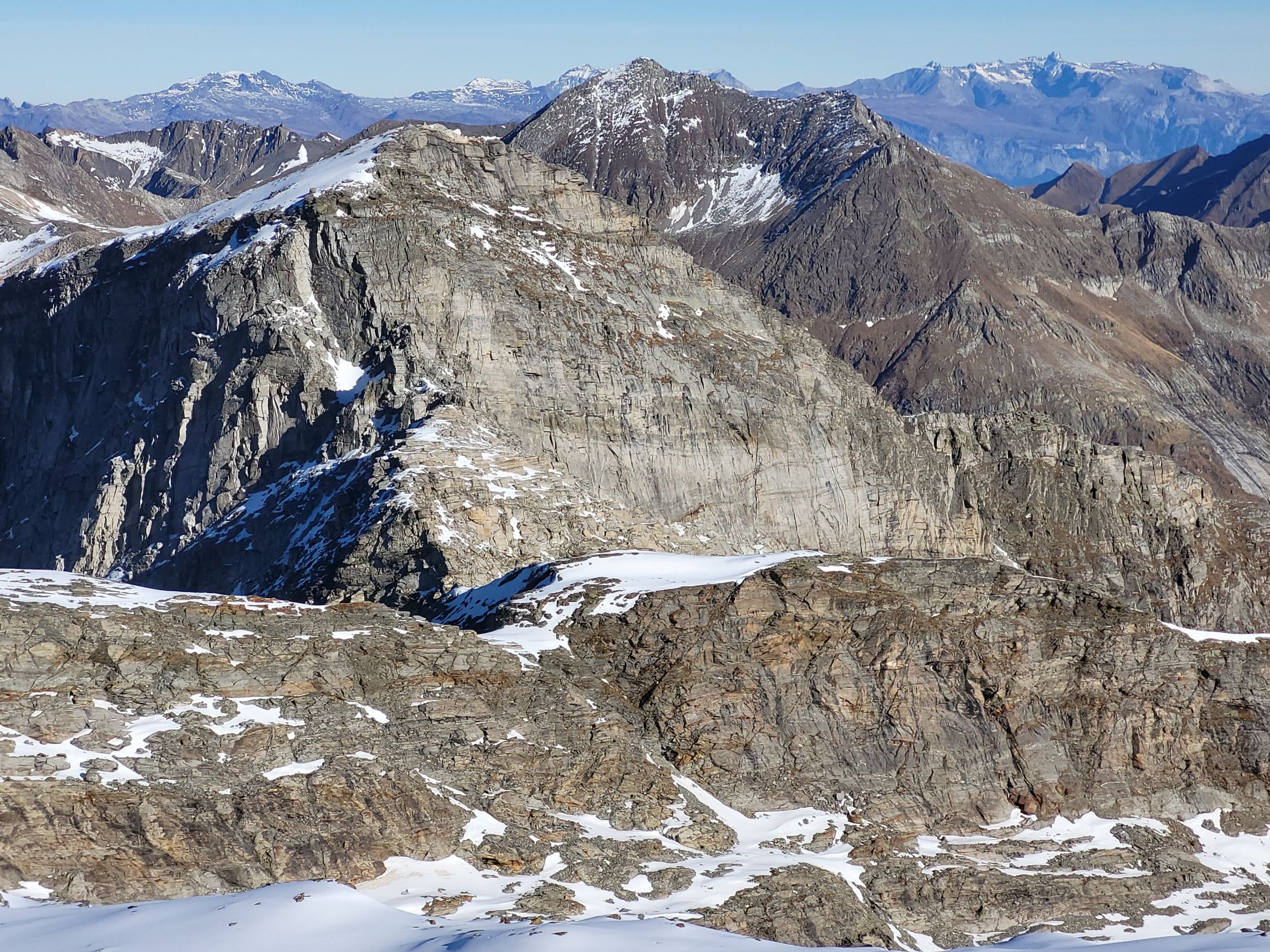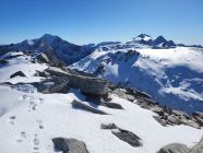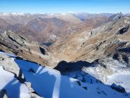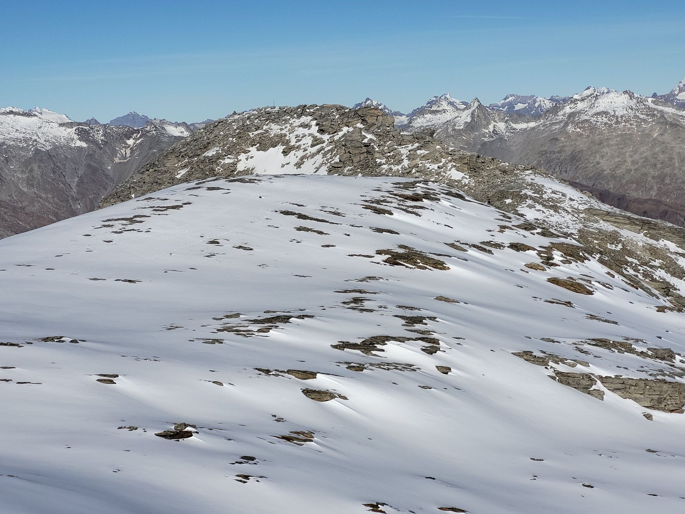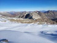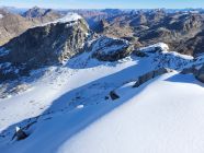 Aufstieg über den Laghetto Cassimoi. Rechtshaltend durch Geröll einen begrünten Rücken hoch, dann etwas im Zigzag zu einem Schneefeld. Ab jetzt einfacher mit Steigeisen zum See und weiter links ausholend über die Nordflanle zum P3100. Über das Plateau zum Gipfel.