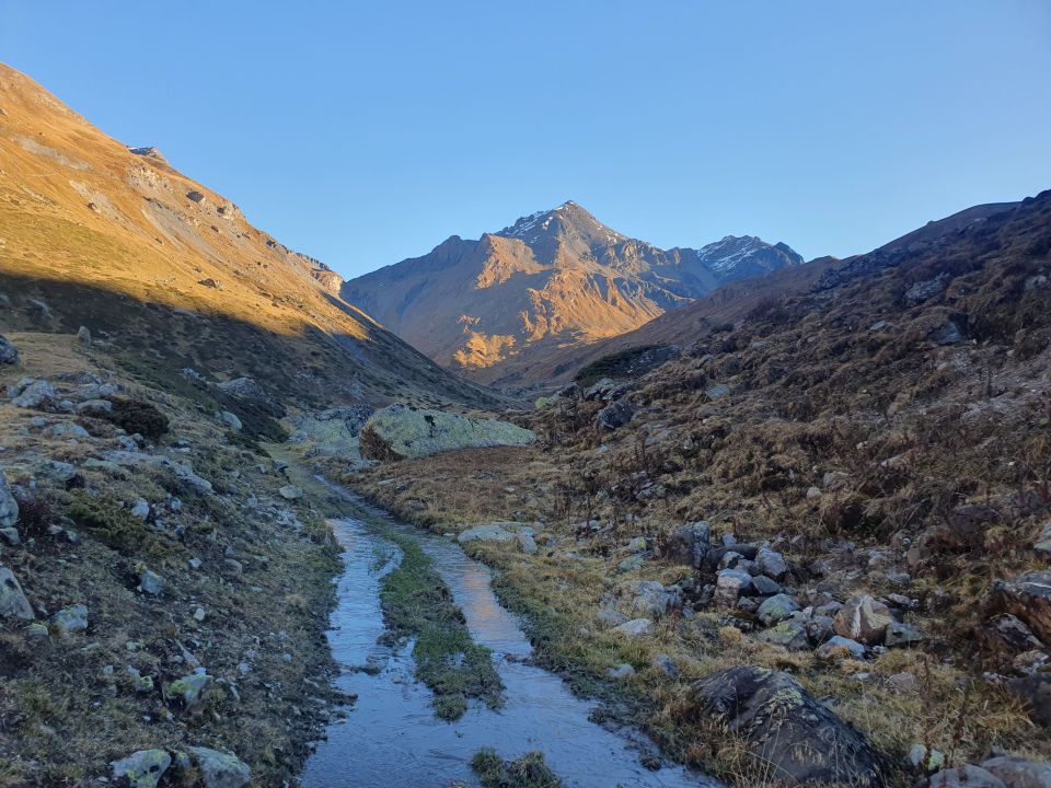 Am Morgen waren die Teiche auf dem Forstweg gefroren. Bei Plan da Mattun (P2276) habe ich bei einer Bachüberquerung ungewollt wieder einmal ein Fuss mit Schuh kalt gewaschen. Dieses Mal war eine eisige Oberschicht daran schuld...