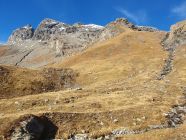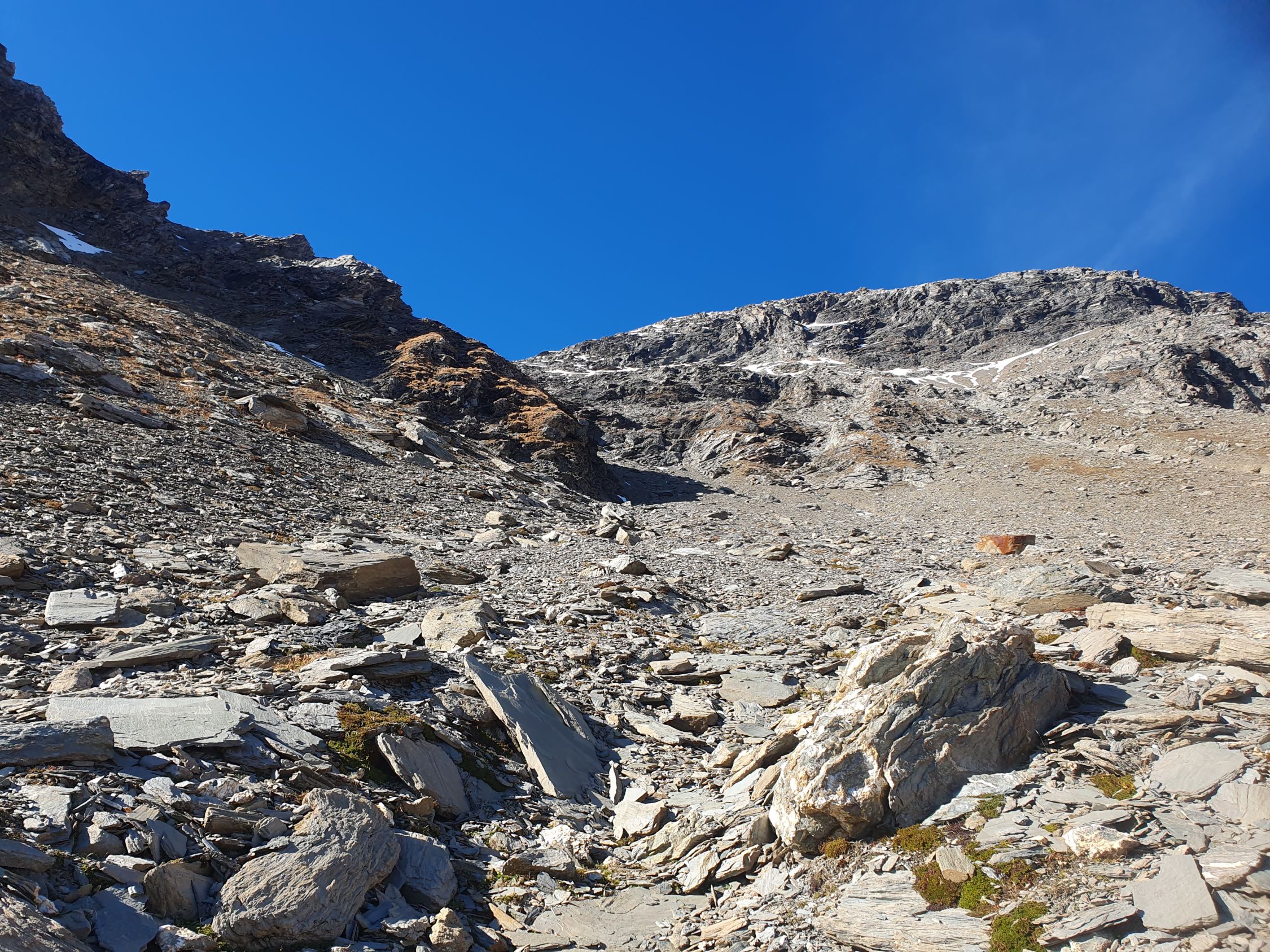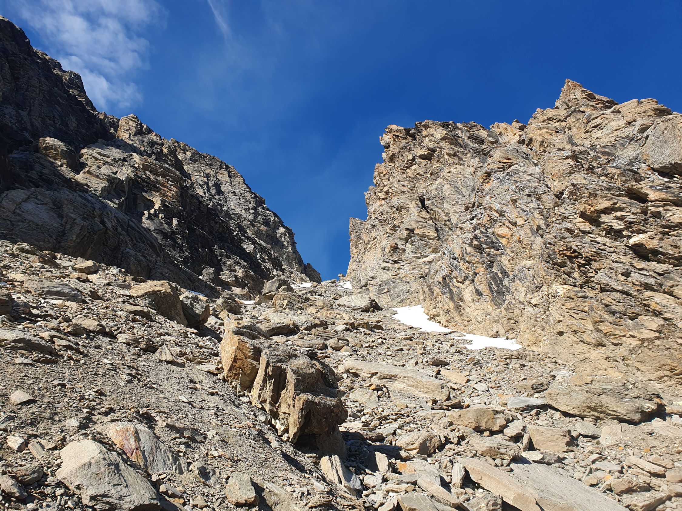 Dann einem festen Geröllfeld nicht all zu steil hoch und zwischen zwei Felsen durch zu P2811 (T3+).