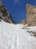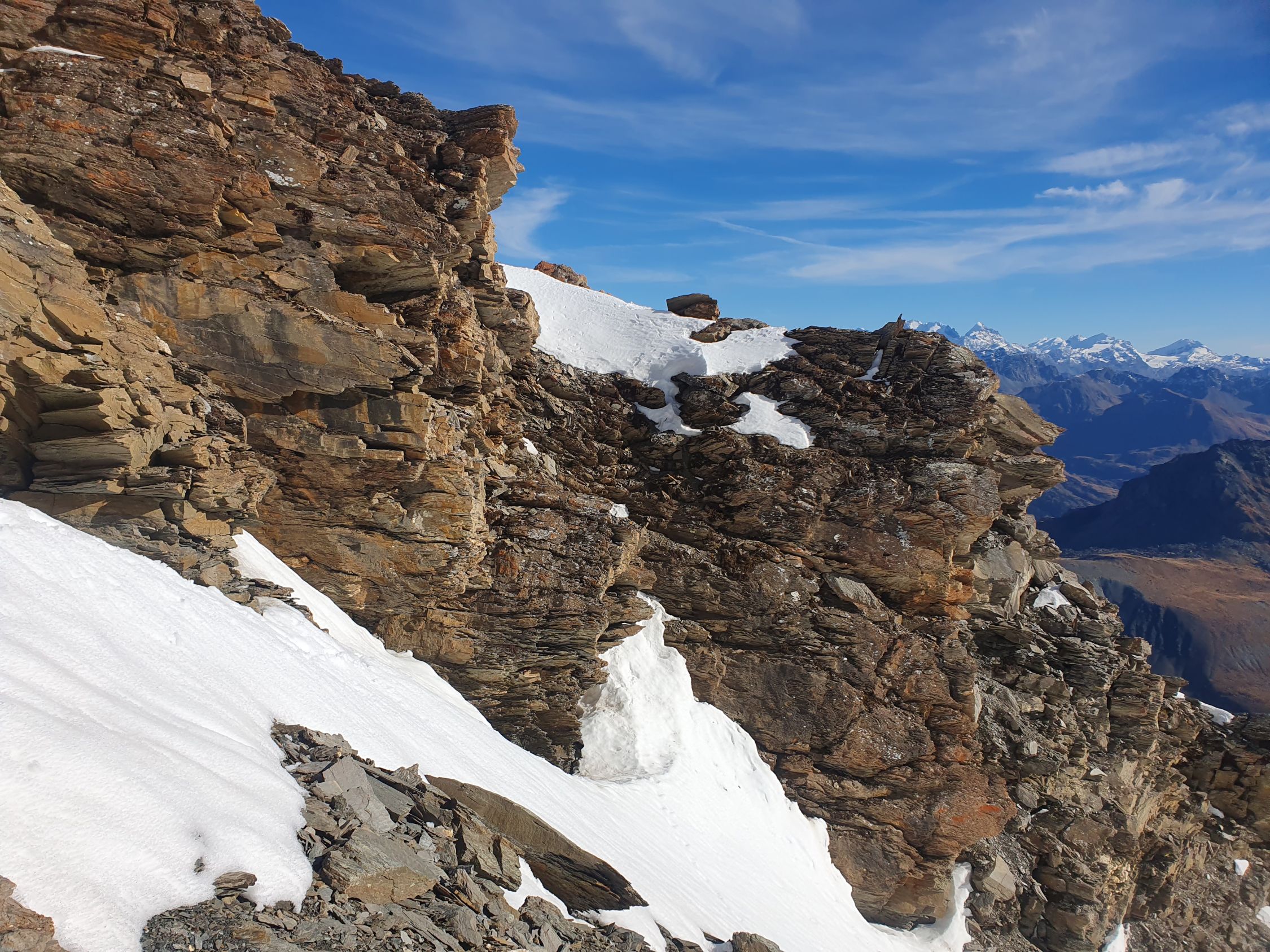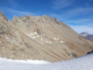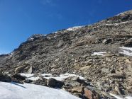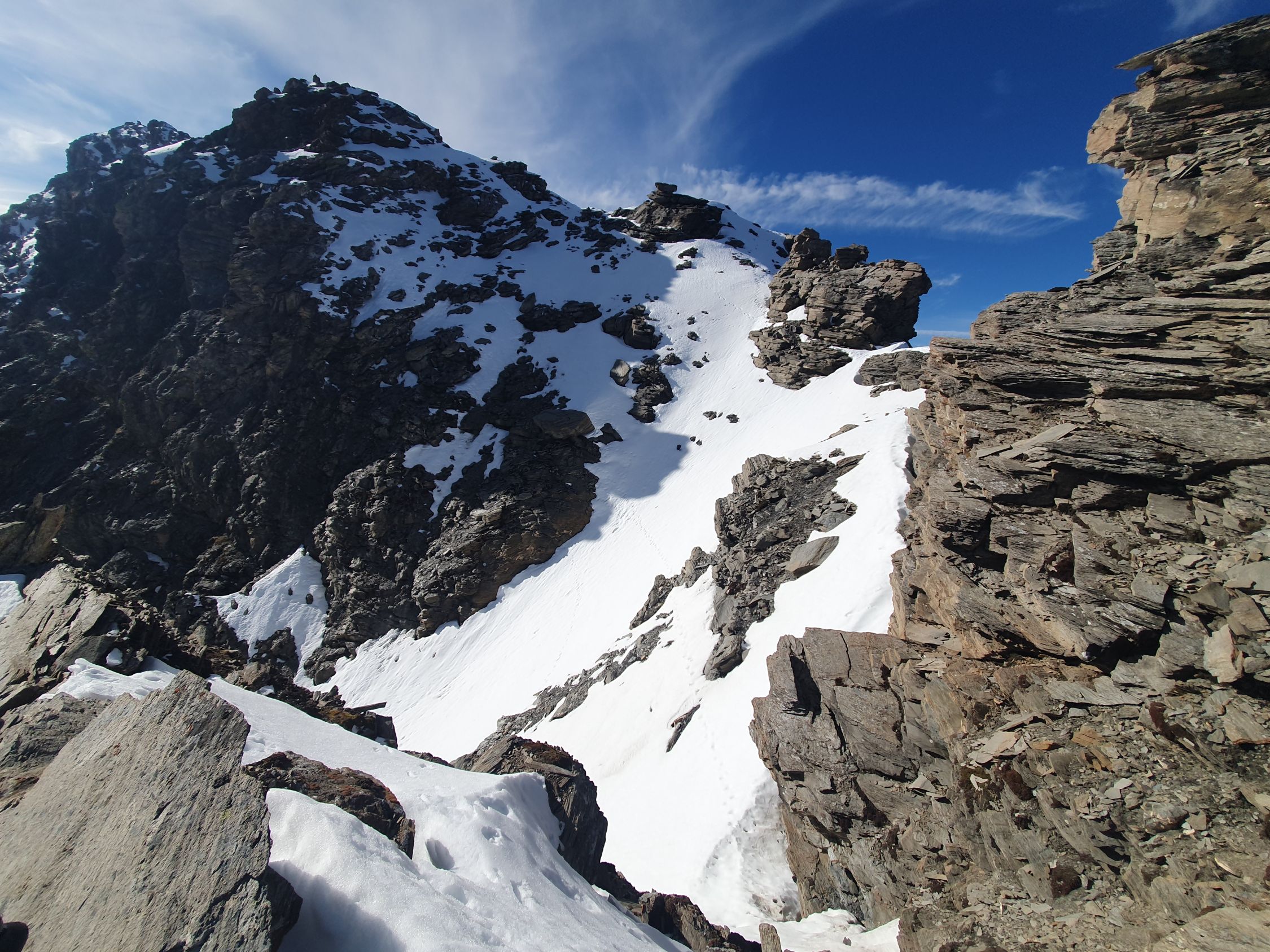 Dann nach NW hoch immer steiler werdend zum Grat (T4). Mittig vor dem Grat erdiger Kies, aber nicht unamgenehm. Später vor dem Grat geschlossene und tragende Schneedecke (T4+).