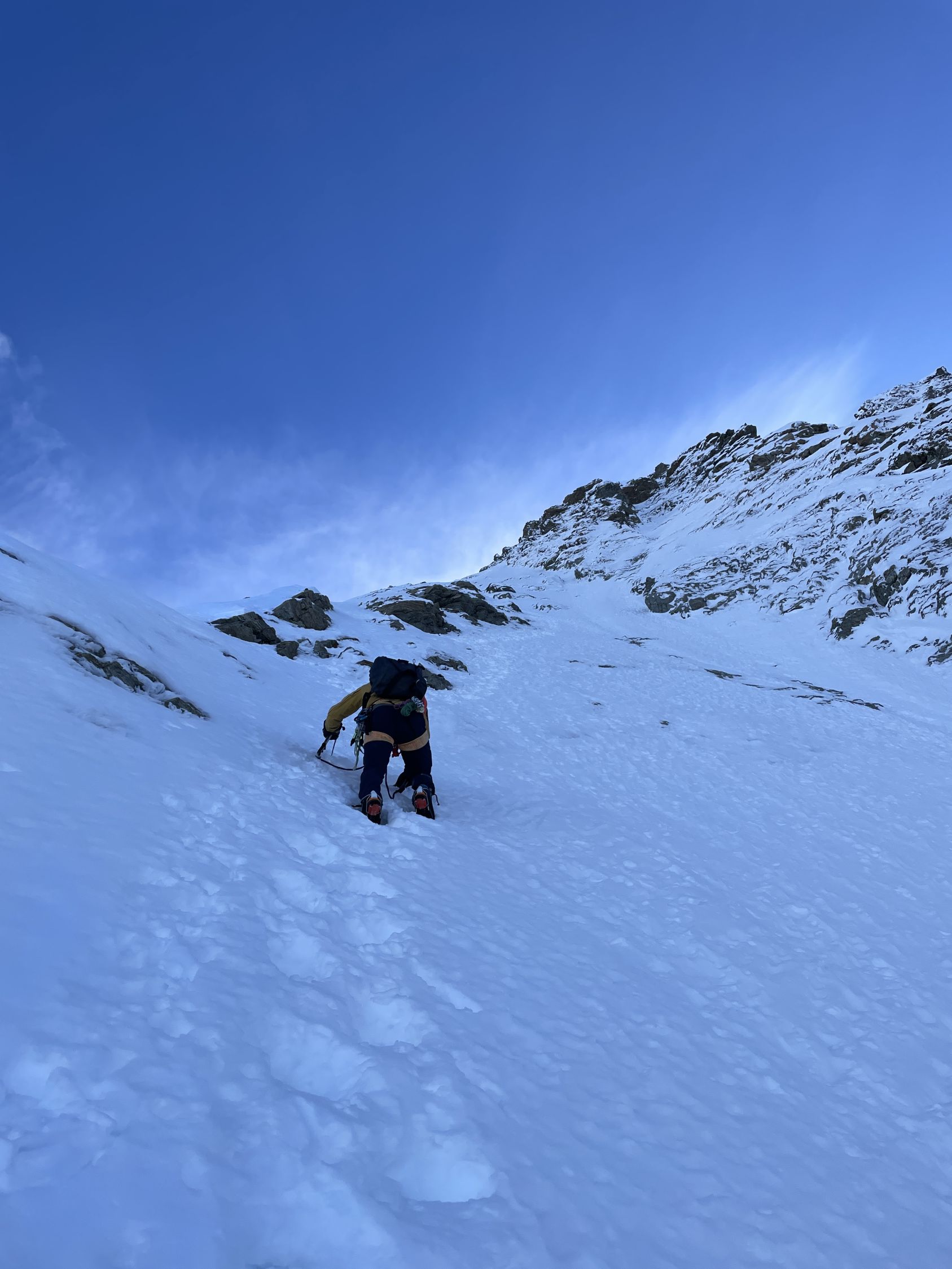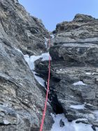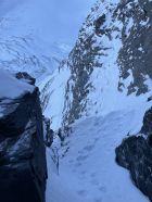 Ab 3200 m Pulver, gut gespurt. Die erste Felsstufe kann über die Flanke nordwestlich umgangen werden. Der Zustieg zum Band erfolgt über eine kurze Stelle M3-4, absicherbar. Das Band zur Rissverschneidung mit viel Schnee (gut). Der Riss mit wenig Schnee und Eis. Der Ausstieg aus dem Schulterstand aper. Der Rest des Aufstiegs im Pulver (gut gespurt). Sichern am ehesten mit Schneeanker. Auf der Rippe liegt viel Schnee.
