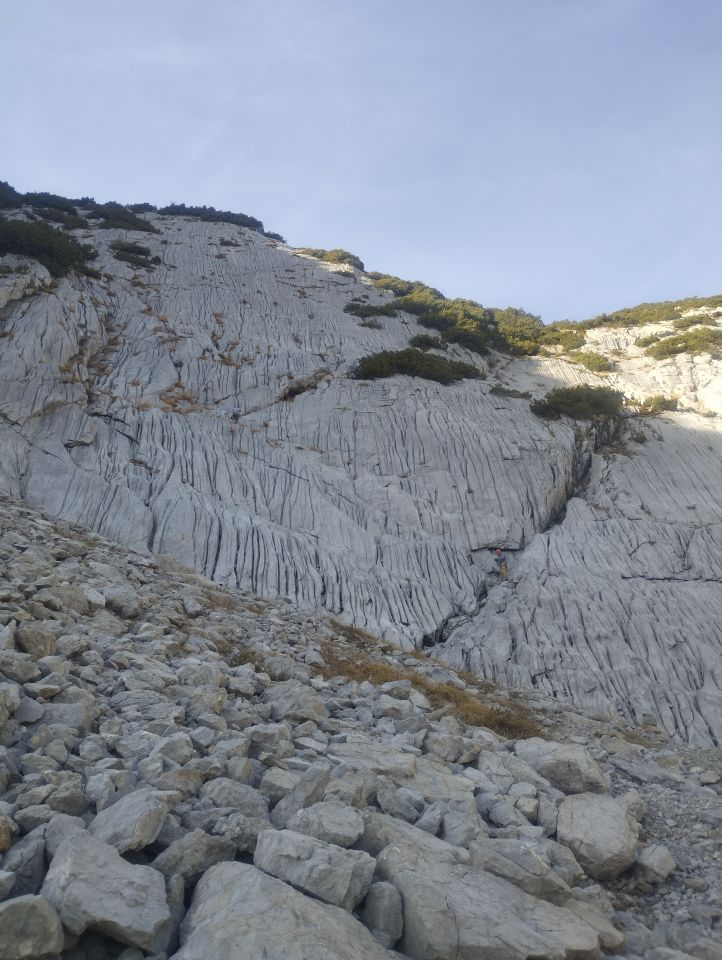 Einstieg in die Platte um ca 15:00. Route ist dann mehrheitlich im Schatten. Kein Schnee und alles furztrocken. Sind die obere Platte ohne Seil geklettert und somit genau zum Sonnenuntergang auf dem Vorgipfel angekommen. Danach Überquerung zum Hauptgipfel bei Dämmerung und Abstieg bei Dunkelheit. Top Timing, schön wieder Mal hier zu sein! :)
