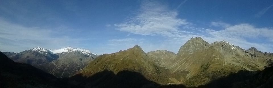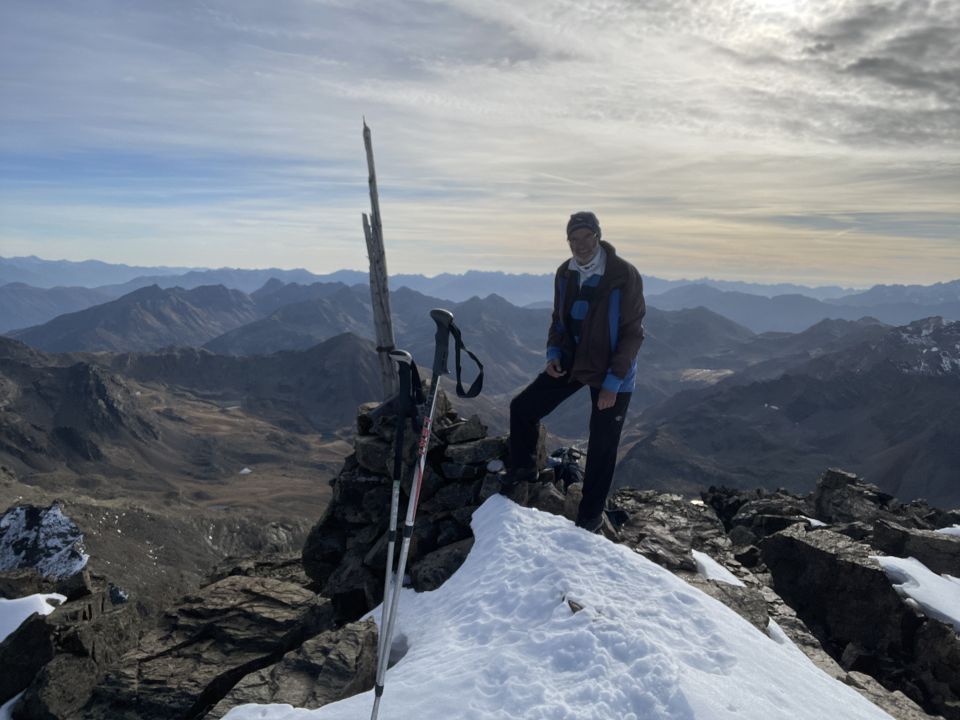 Vom Gipfel erblickt man im Norden die weißen Ortler-Berge. Während der Wintersaison vom 28.10.2024 bis 28.5.2025 wird die Kleinbuslinie von Sfazù zur Alpe Campo nicht bedient.