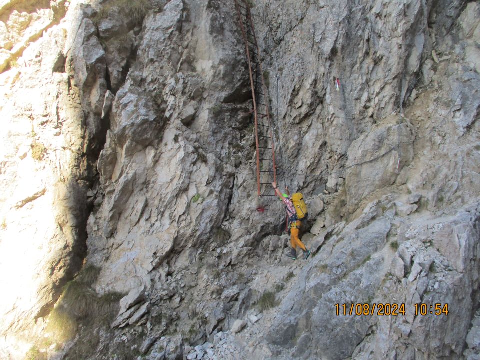 Aus unserer Erfahrung heraus macht die Mitnahme eines Klettersteigsets keinen wirklichen Sinn. Fast alle der als "Via Ferrata" bezeichneten Passagen sind mit älterem Material ausgestattet und häufig auch nicht mehr im technisch einwandfreien Zustand, wenngleich man gemäß unserer Erfahrung den Ketten bei Belastung vertrauen darf. Oft hängen die Ketten aber ohne jegliche Zwischensicherung herunter, oder mehrere Verankerungen sind etwa durch Steinschlag herausgebrochen. Der gleiche Zustand gilt für Eisentritte und Stifte. Zudem müssen immer wieder auch Passagen bis Schwierigkeit 2 frei gegangen werden.