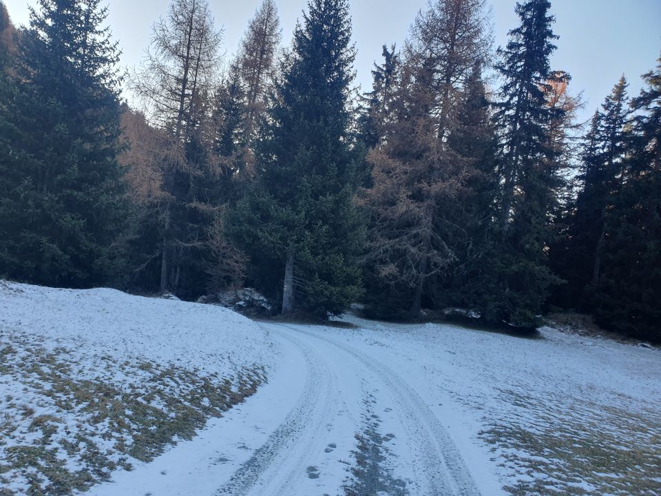Mit dem Velo schafft man die 10km bis Ardez in 30 Min., obwohl man acht vor den Eis- und Schneepassagen auf dem Forstweg nehmen muss.
