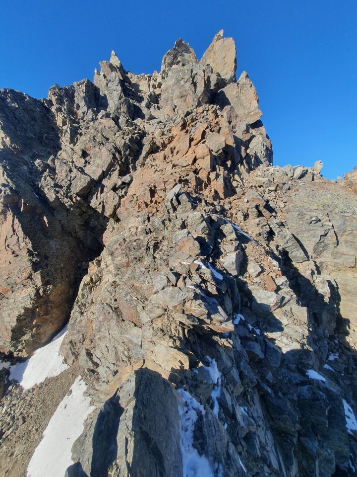 Hier habe ich vorsichtshalber schon mal den Pickel ausgepackt. Ich habe da den westlichen Hang kurz steil traversiert und so bald wie möglich rechts auf dem Restschnee hochgestiegen. Da der Schnee schon etwas aufgeweicht war, ging es auch nur mit Pickel, resp. ohne Steigeisen. Im Westhang muss man sich rechts halten und nicht versuchen auf der linken Seite hochzusteigen, da man dort weiter oben nicht mehr weiter kommt. Kurz danach führt eine Rinne ziemlich direkt hoch zum Grat. Nun kommt kurz eine luftige Passage über unstabile Steine, d.h. unbedingt etwas Zeit in der Steinprüfung investieren. Nach dieser Stelle geht es steil hoch über schuttiges Gelände, wo man das Gefühl hat, dass jeder Stein unstabil zu sein scheint. Sobald diese Stelle gemeistert ist, geht's auf dem Grat unschwierig bis zum Gipfel.