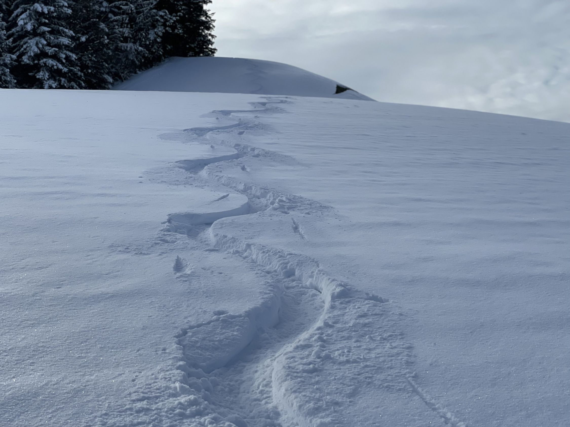 Schnee: da es der zweite Tag nach den starken Schneefällen war, konnte sich bereits ein schwache Unterlage bilden, ca.20-30cm Pulver ohne Bodenkontakt