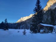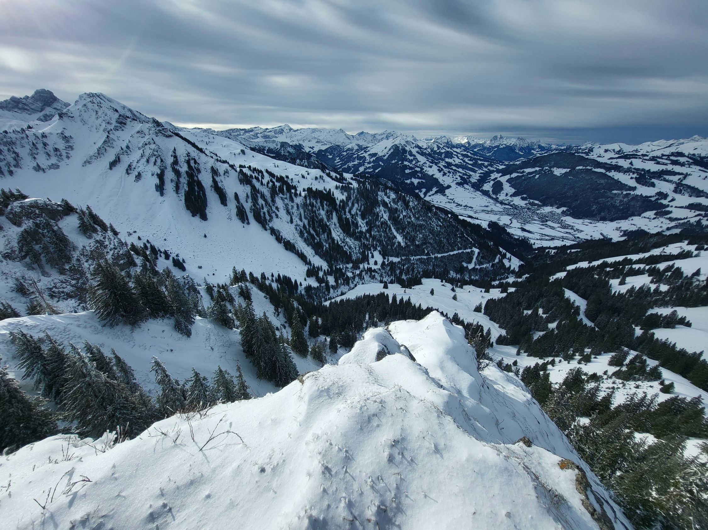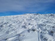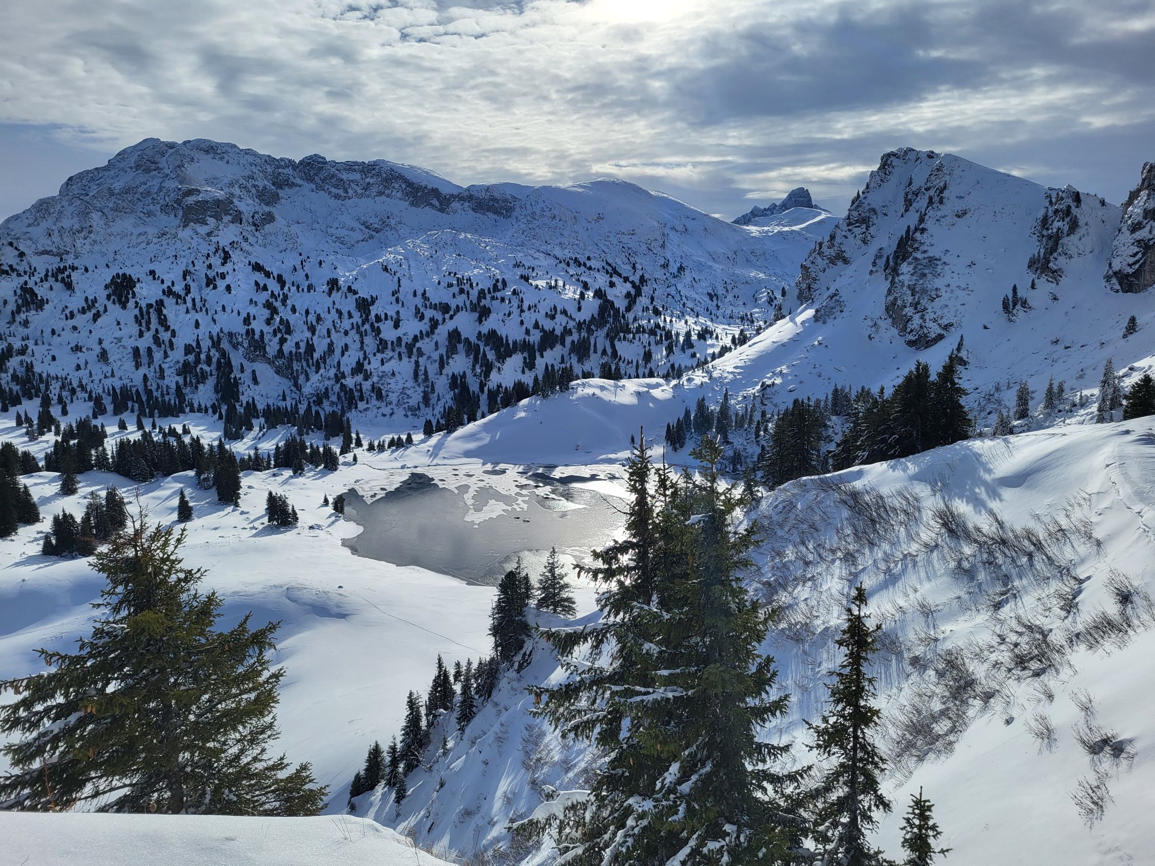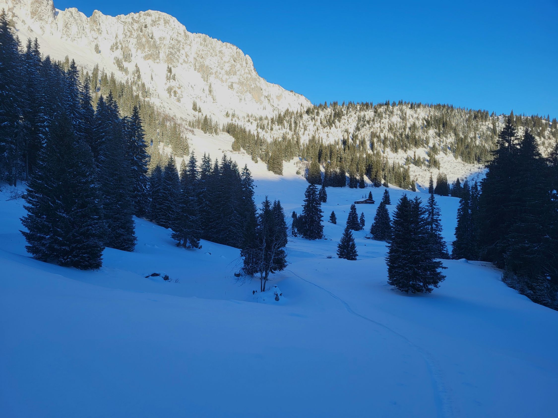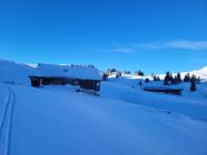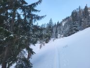 Aufstieg zum Gestelengrat wieder komischer Schnee (Deckel), dann der Höhe entlang zum Puur. Von dort schöne Pulverschneeabfahrt zur Alp Obergestele. Durch den Chüewald wieder schwieriger zu fahren, danach auf der Strasse problemlos zum Parktplatz.