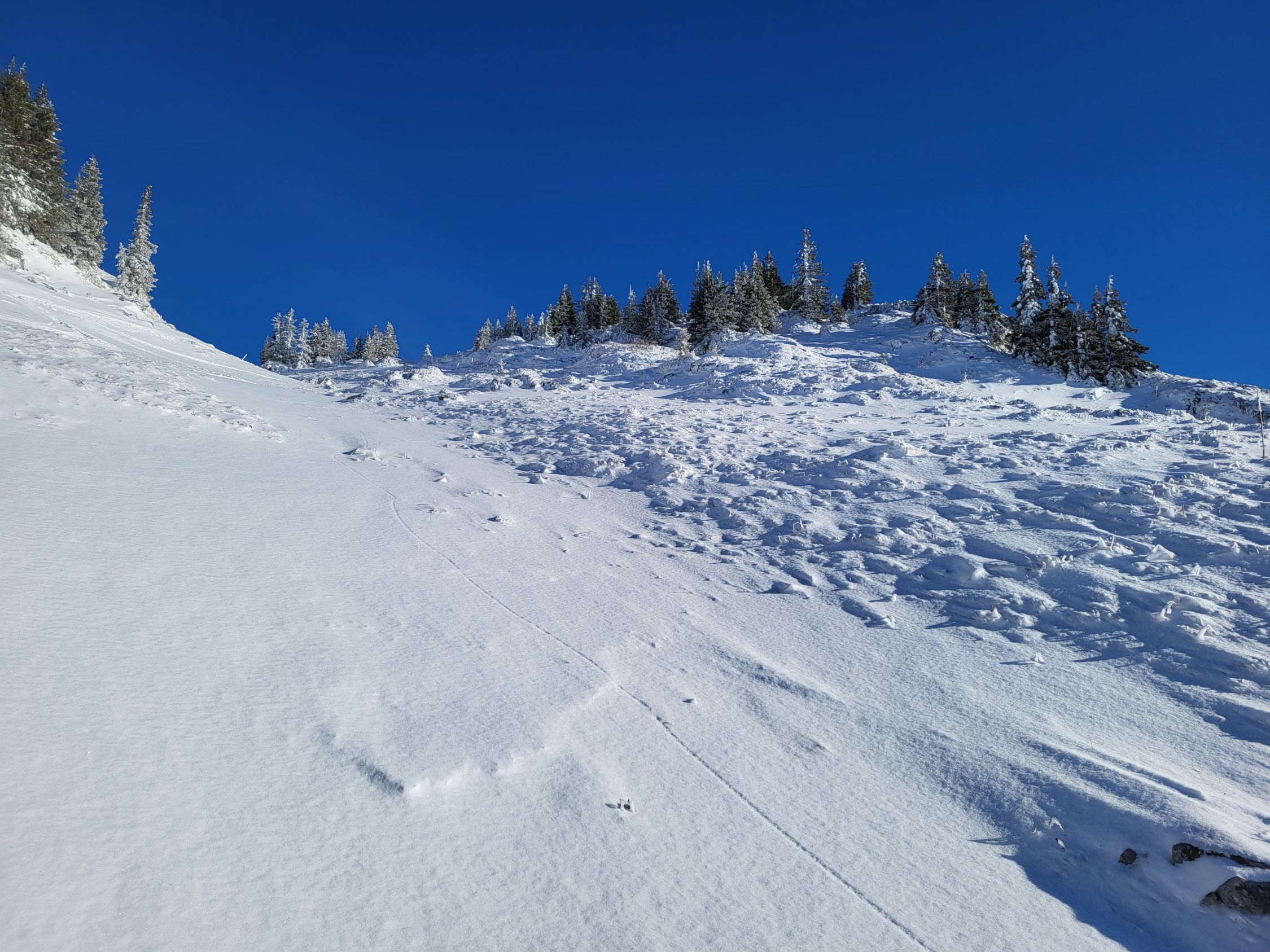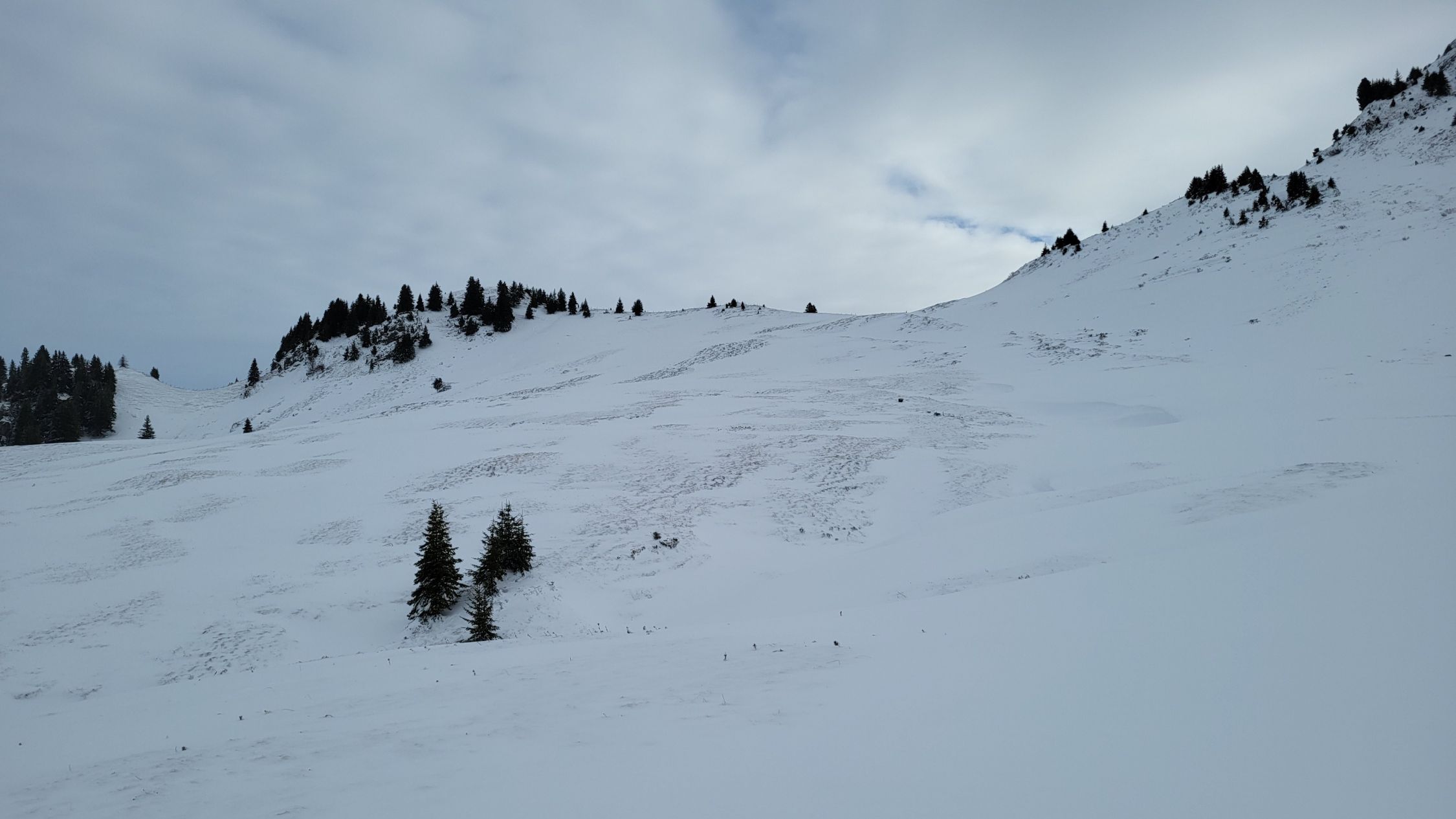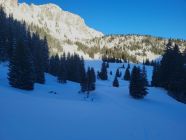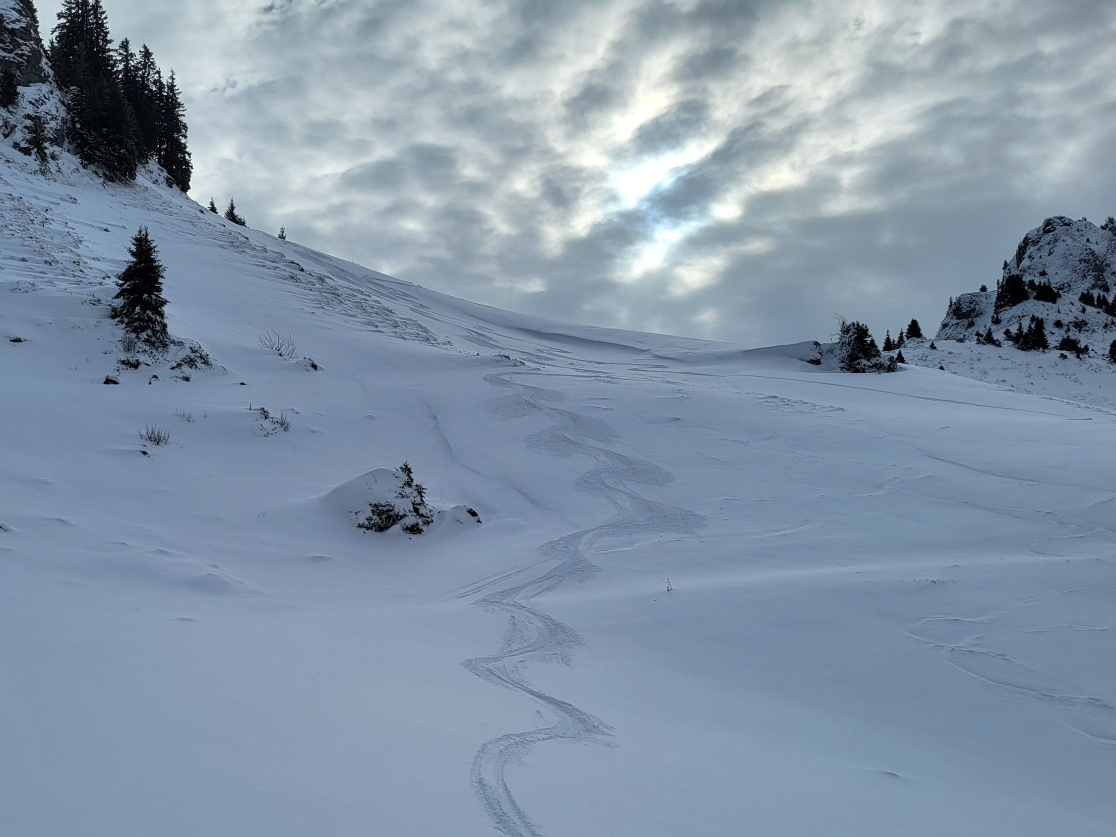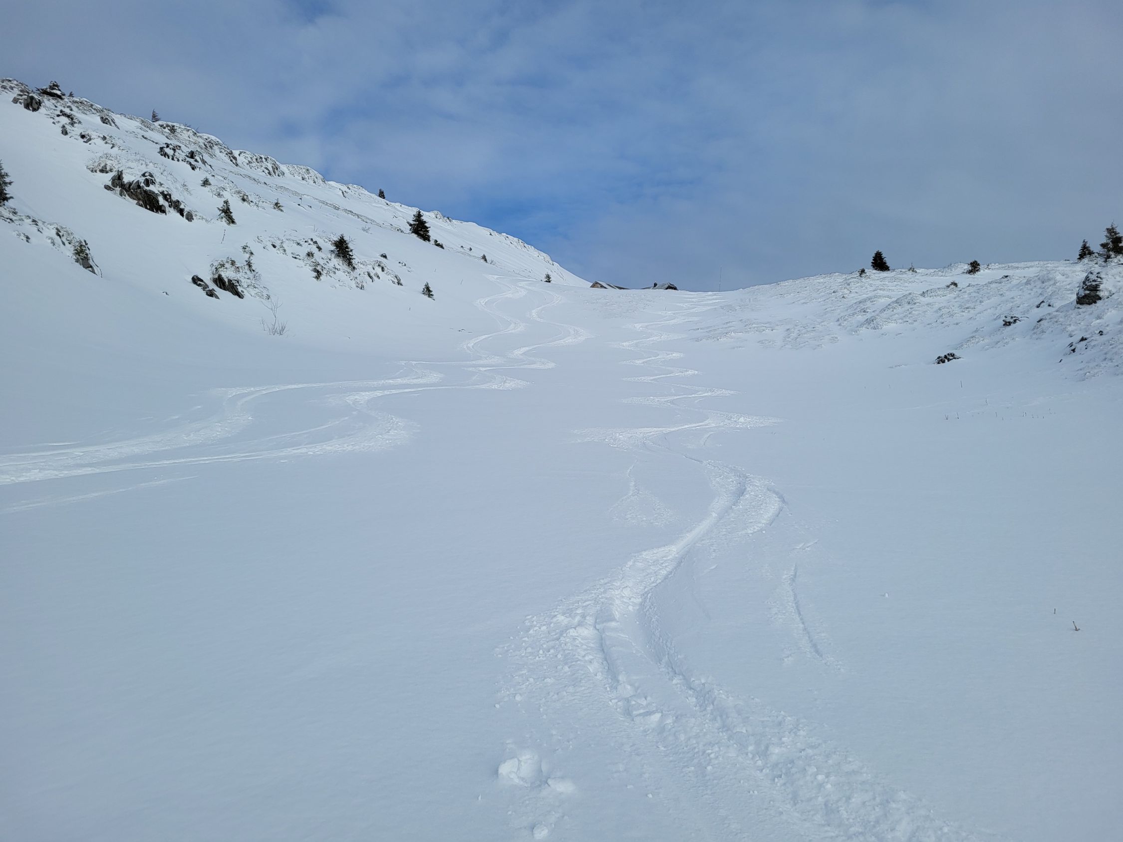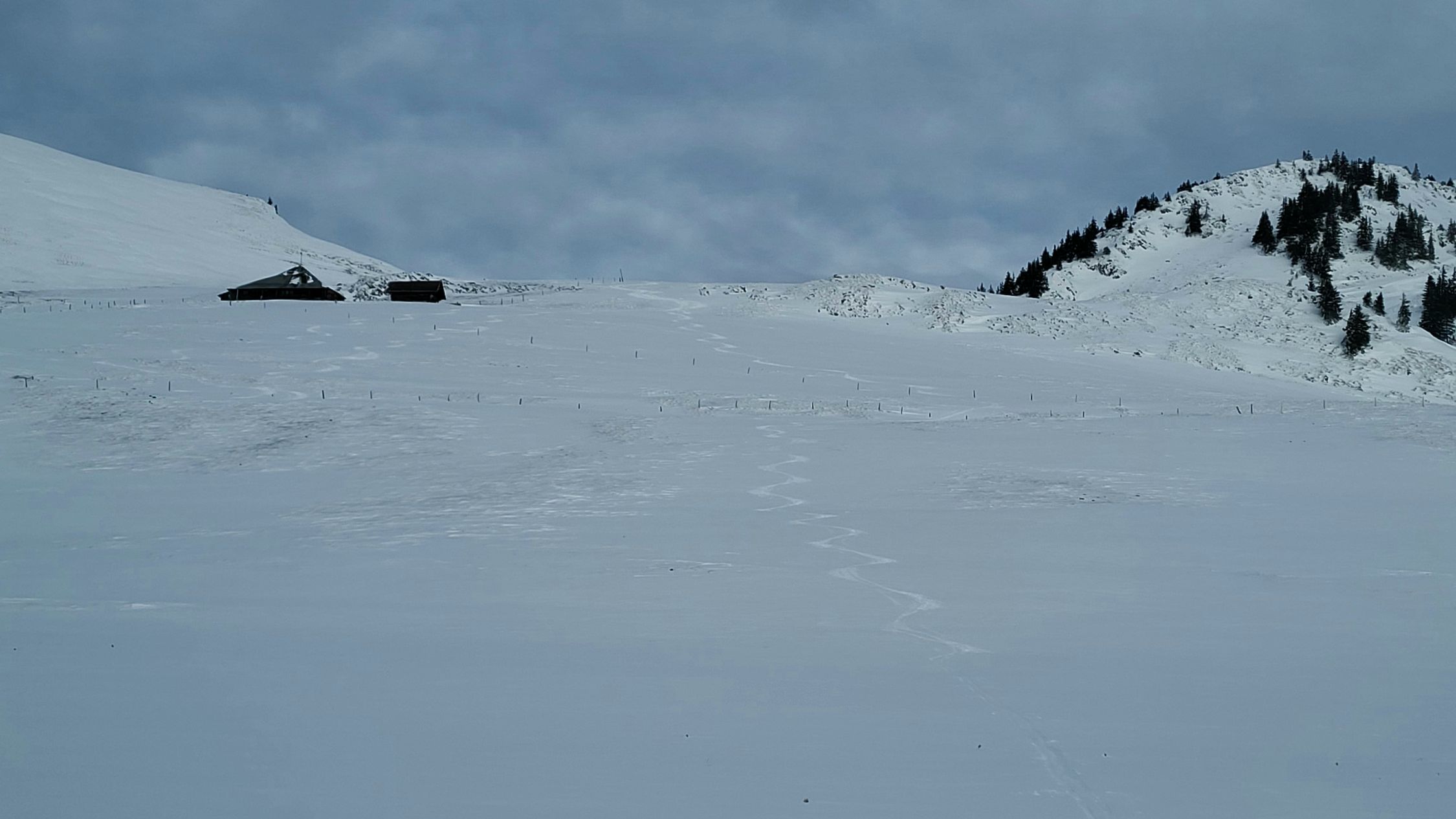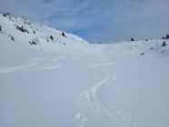 Abfahrt in der Mulde nach der Alphütte Punkt 2027 okay, im Hang zwischen Punkten 1908 und 1852 teilweise eisig.