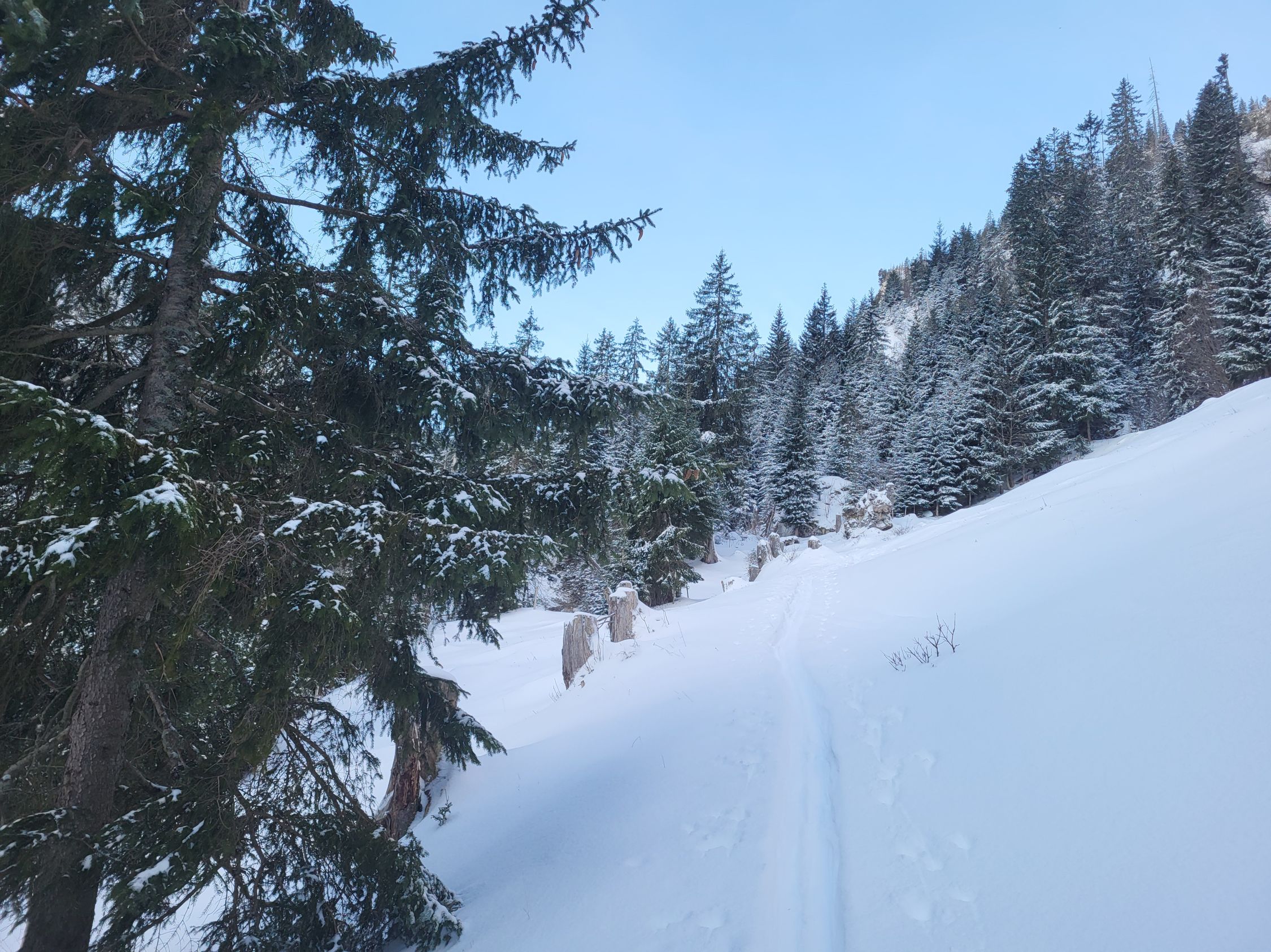 Start um 8 Uhr beim Parkplatz Meniggrund (Punkt 1345). Die Strasse ist bis dort geräumt, aber im obersten Teil ziemlich eisig. Aufstieg zum Brätliplatz problemlos, es hat genügend Schnee auf der Strasse (auch für die Abfahrt).