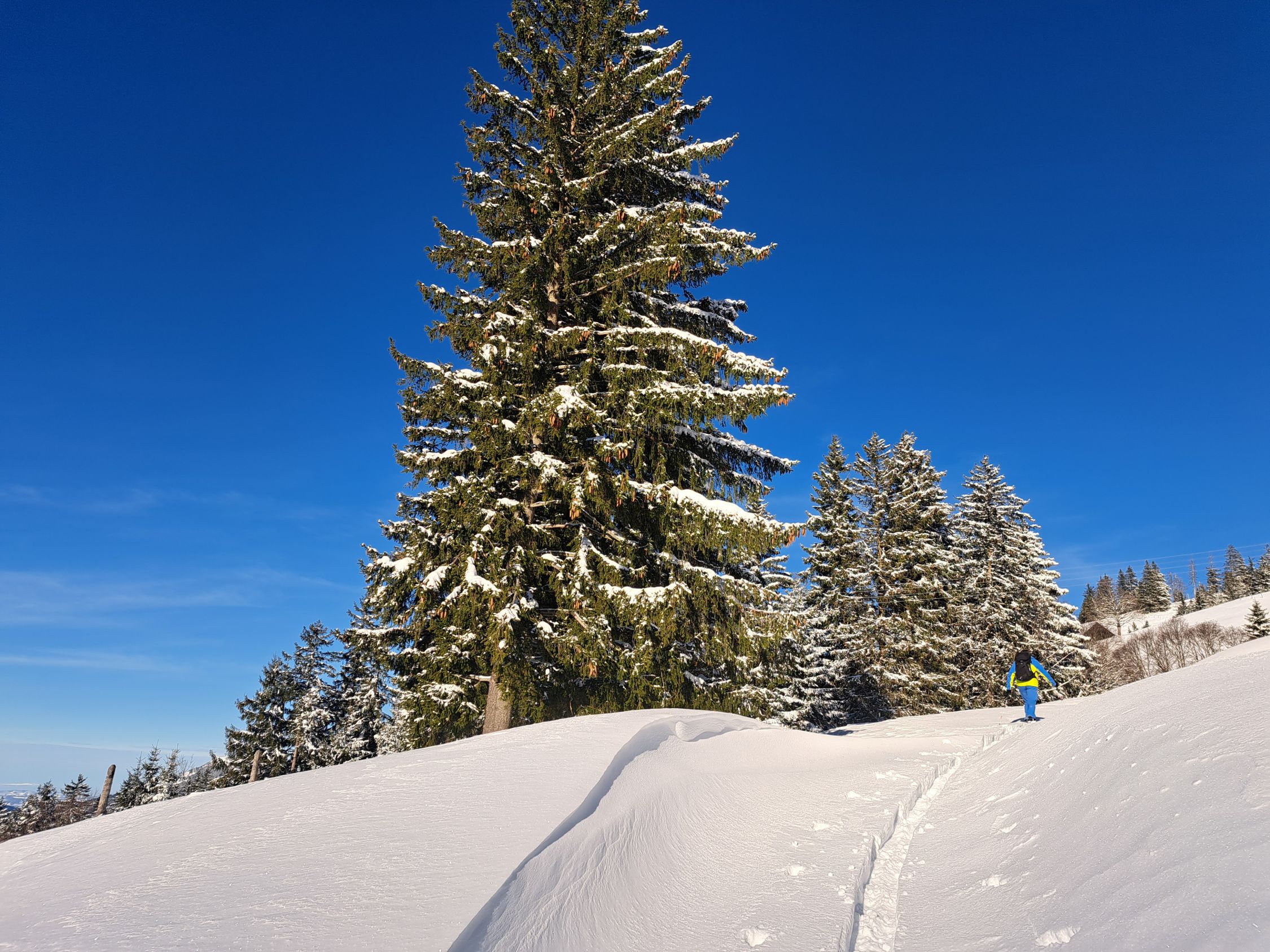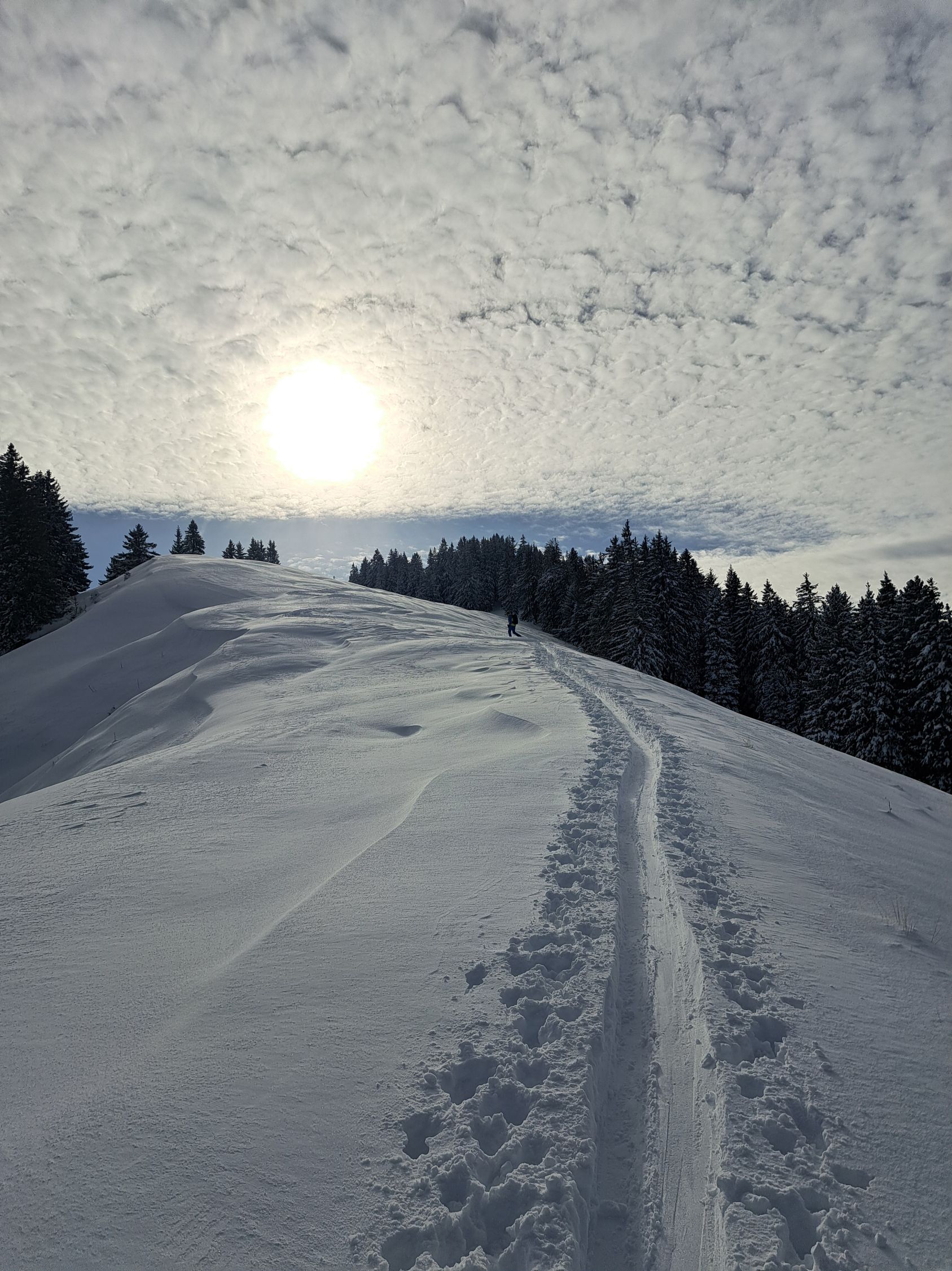 Auf gute Aufstiegssput über Mostelberg, Herrenboden, Bärenfang zru Spillmettlen. Weiter über Bannegg zum Hochstuckli. Am Grat war der Schnee sehr windbearbeitet.
