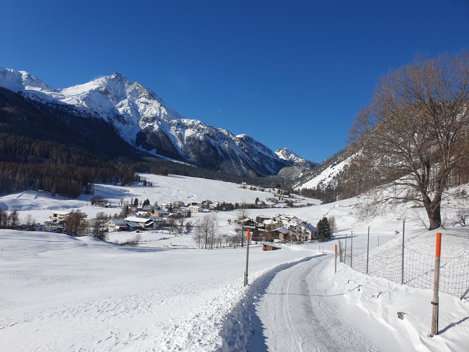 Auf dem Forstweg durchgehende Schneedecke. Ich bin auf dem Forstweg (Schlittelweg ist noch nicht präpariert) bei P1847 auf dem Wanderweg nördlich direkt hoch zur Alp Champatsch hochgestiegen. Diese Route empfiehlt sich aufgrund der aktuellen geringen Schneemengen nicht als Abfahrt. Dann weiter bis unterhalb von P2207 und dann nördlich hoch über einfaches Gelände zum Mot Radond.
