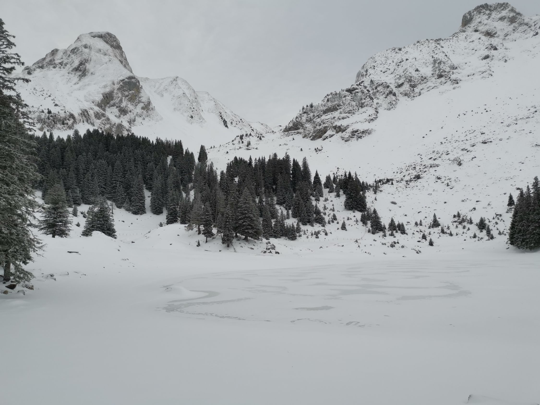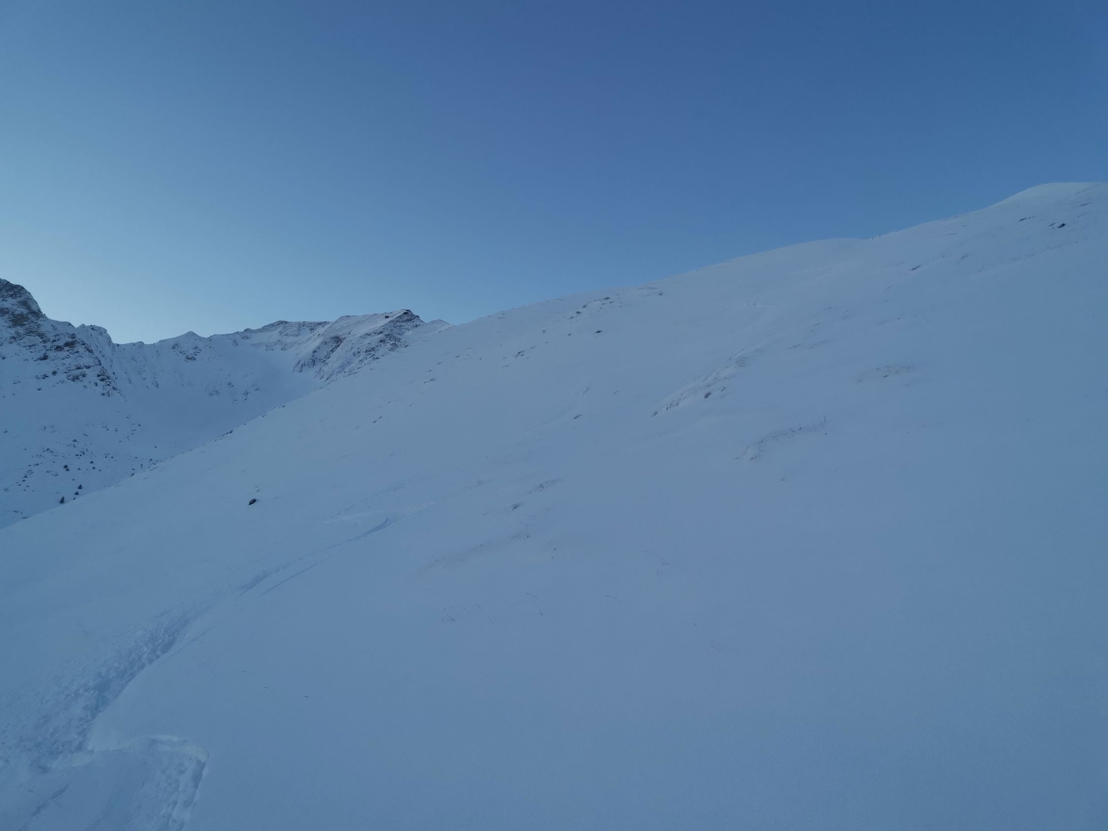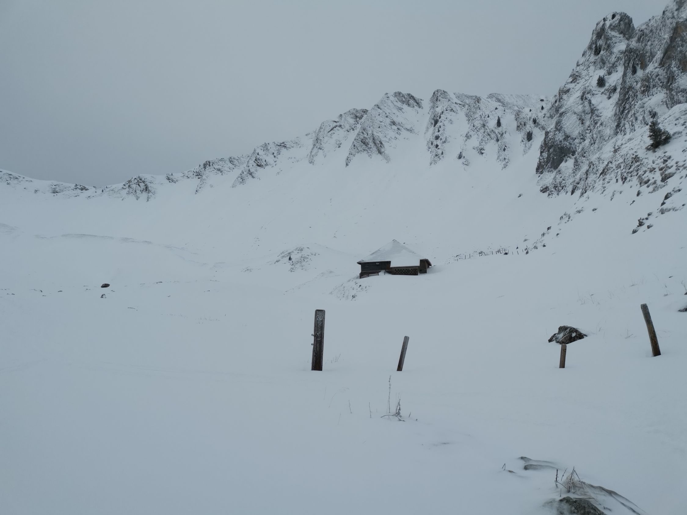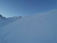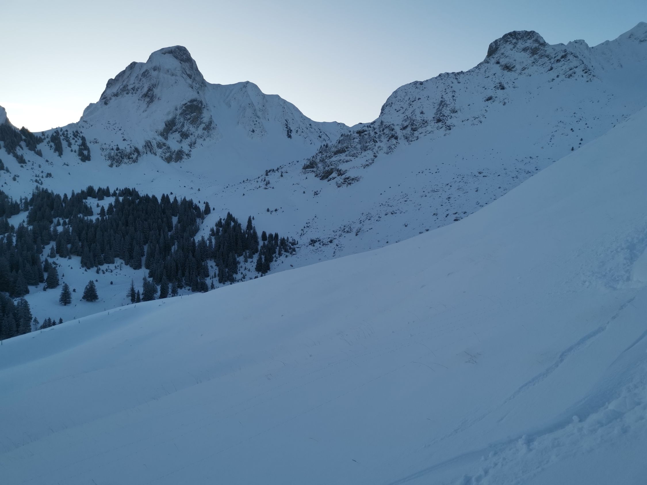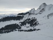 Oben etwas abgeblasen, unten schöner Pulver auf knapper Unterlage. In den Mulden auch oben gut zu fahren.
