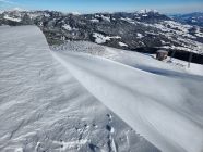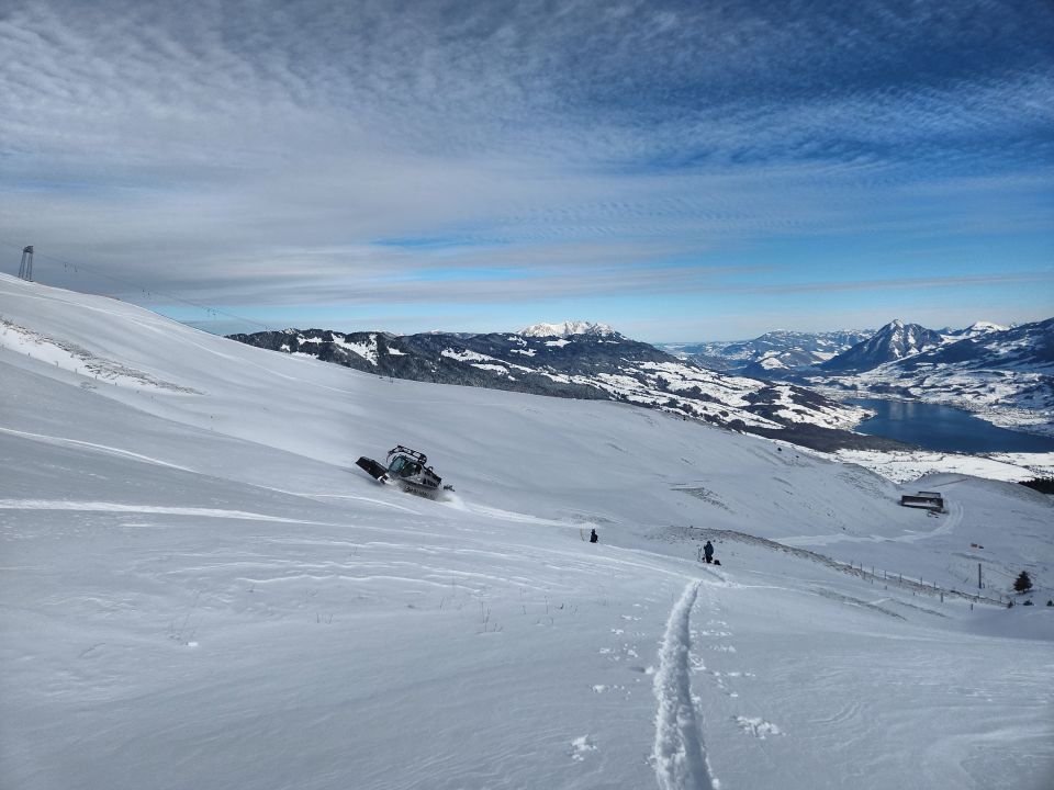 "Lob": Wenn in Adelboden die Pisten gemäss Werbung von Heinzelmännlein für jeden Gast frisch bereitgemacht werden, scheut die Mörlialp tatsächlich keinen Einsatz für Tourenfahrer. Nachdem ich in Richtung Südost hinuntergefahren war und mich anschickte, zum Südgrat hoch zu spuren, kam ein Pistenbully angedonnert und wühlte sich hoch. Einen stärkeren Vorspurer hätte ich mir nicht wünschen können. Wie "üblich" überholte ich zum Schluss gut erholt und war als Erster auf dem Gipfel.