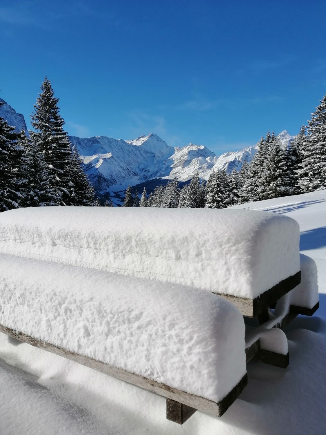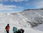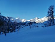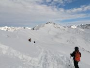 Wir sind den Osthang abgefahren. Dort bis runter zum Fahrweg "Spilboden" 50-60cm, leicht gesetzter Pulver, nicht offensichtlich verblasen, aber im unteren Teil teils Wum Geräusche. Vermutlich gab es Verfrachtungen bei den ersten Schneefällen, die wieder gut zugedeckt sind. Der Fahrweg "Spilboden" war sehr angenehm zu fahren.