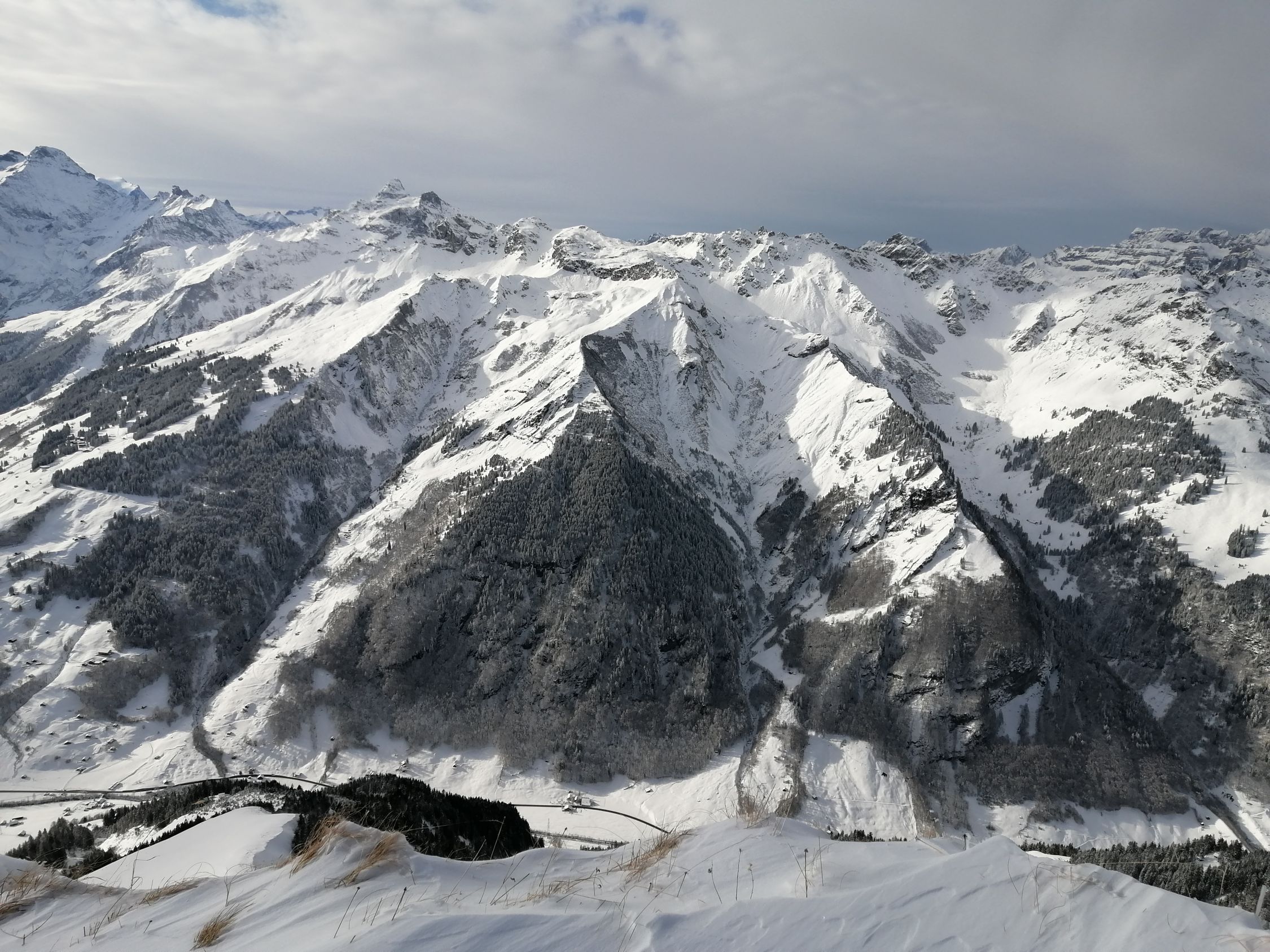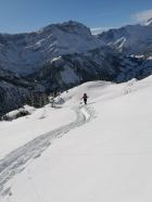 Richtung Färispitz, Grünenspitz abgeblasener, Kärpf Seite sieht dagegen gut aus. Volle Südseiten sind jetzt nicht mehr pulvrig, am besten auf Osthänge ausweichen.