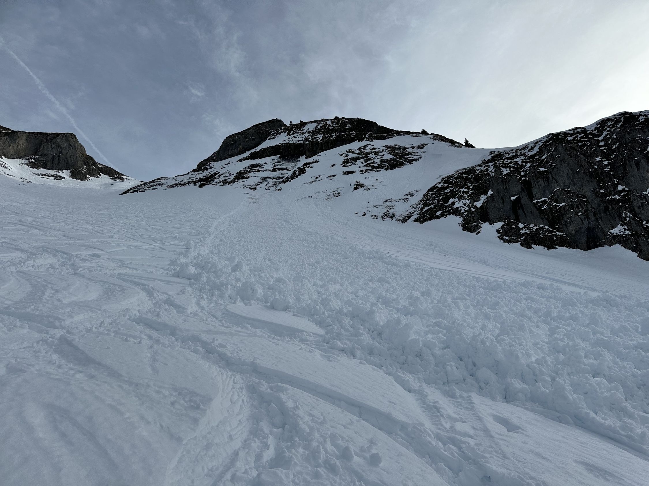 Schon am Vormittag in Folge des Föhns sehr schwerer Schnee. Die Gipfelbereiche von Rütistein, Twäriberg und Druesberg sind stark abgeblasen. In der Twäriberg-Rinne haben wir überraschend grosse Nassschnee-Lawinen beobachtet.