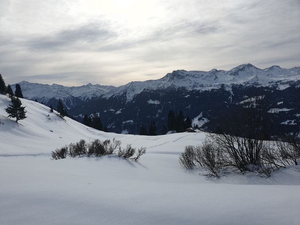 Start in Saas i.P., Haus Fluor um 09:00. Zuerst auf 10 cm steigende Schneedecke ohne Unterlage auf etwas, aufgrund der zu warmen Temperaturen, klebrigem Schnee hoch. Später immer wieder einmal, mit Wanderwegabkürzungen, auf einem unpräparierten Schlittelweg, aber mit einer Autoreifenwegspur drinnen weiter hoch.