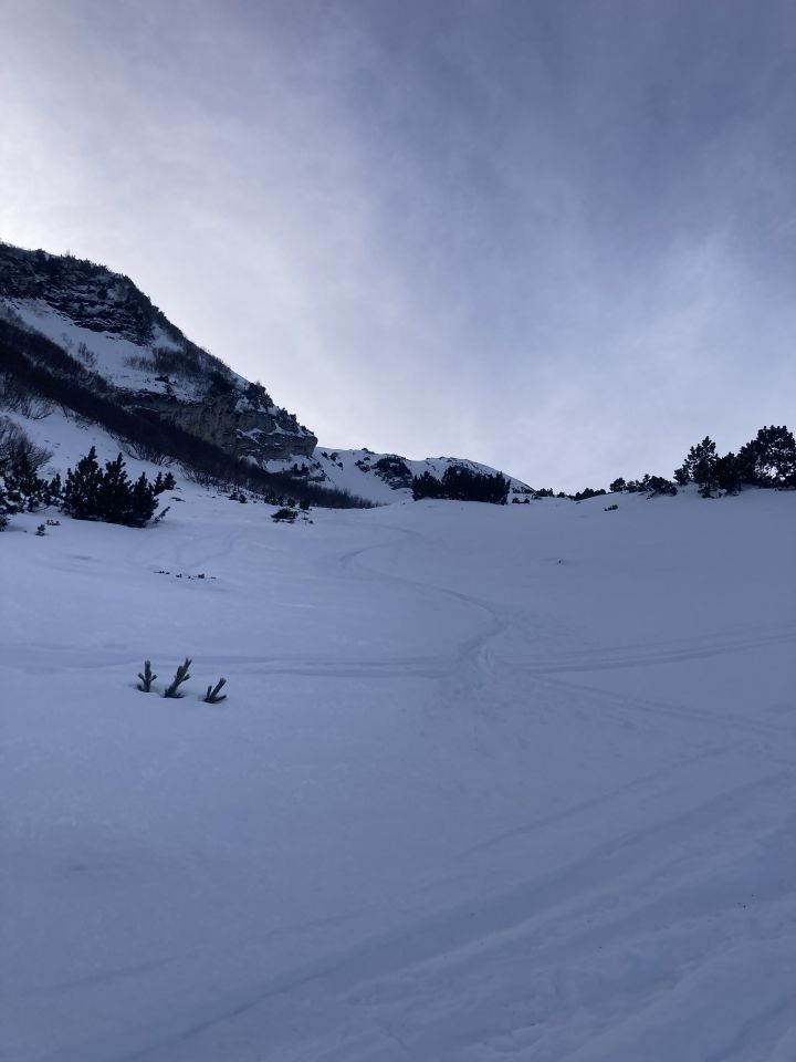 Starker Föhn liess die Temperaturen steigen. Bin auch nur zum Sattel hinauf. Oben sehr schöner Pulver in den Rinnen. Dazwischen tragender feuchter Schnee (Konsistenz wie gut geschlagener Rahm) und nasser, bremsender Schnee. Deswegen auch oben starke Stollenbildung. Zwei Felle lohnen sich…