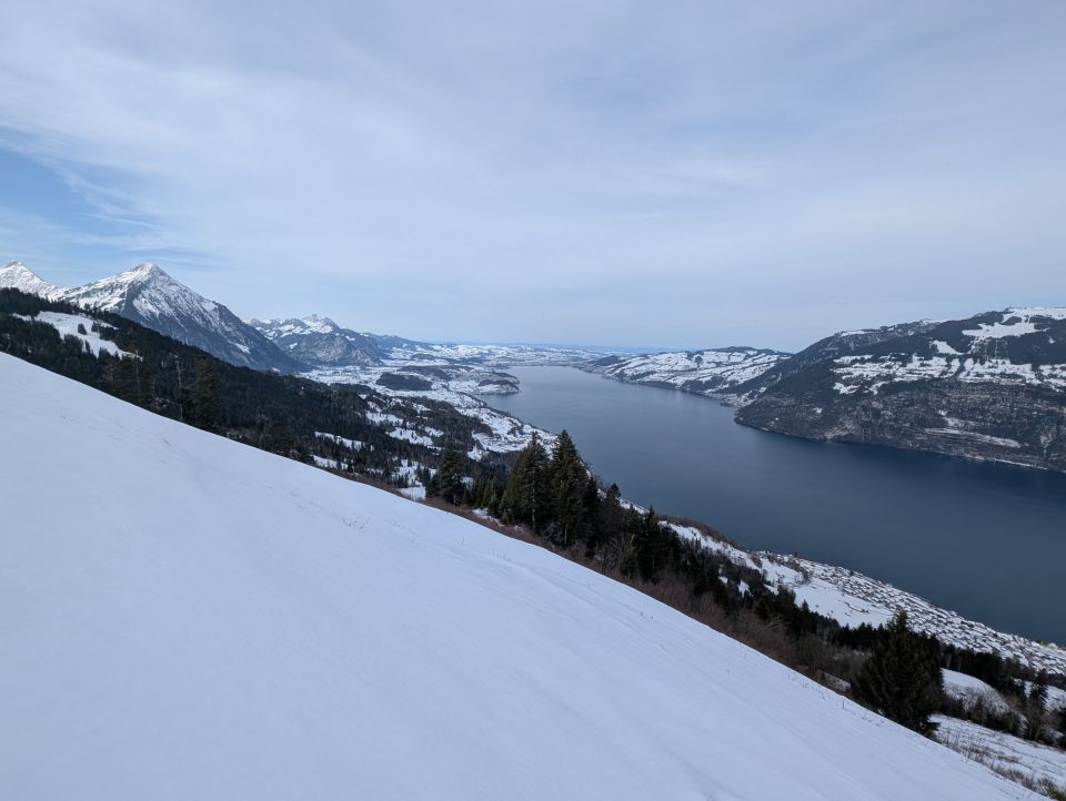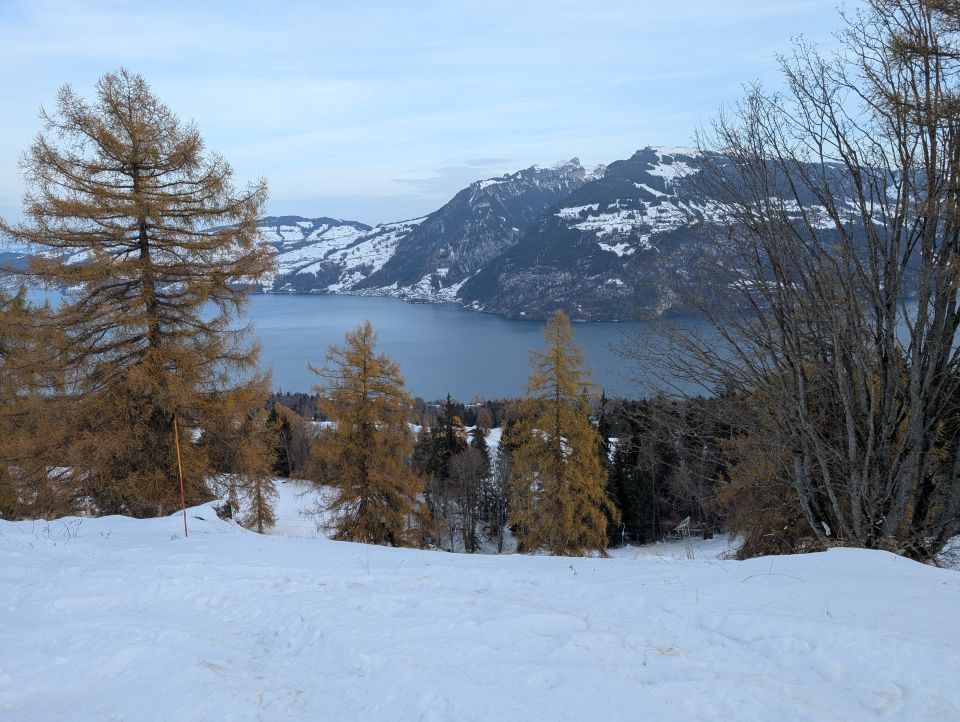 Von Aeschiried bis Leissigen mit den Skis gut machbar. Skis mussten in den steileren Waldpassagen getragen werden. Oben Plüterschnee.