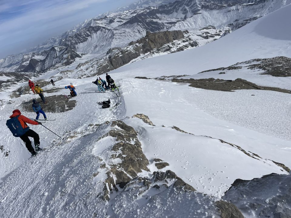 Wir sind von der Mittelstation aufgestiegen. Neben und auf der halb aperen Piste. Ging gut. Danach gute Spur bis Gipfel. Neues Seil an der Abkleterstelle. Geht ohne Steigeisen. Abfahrt Presspulver. Nich t top aber auch OK. Am Gipfel und später an der Bergstation windig und recht kühl.