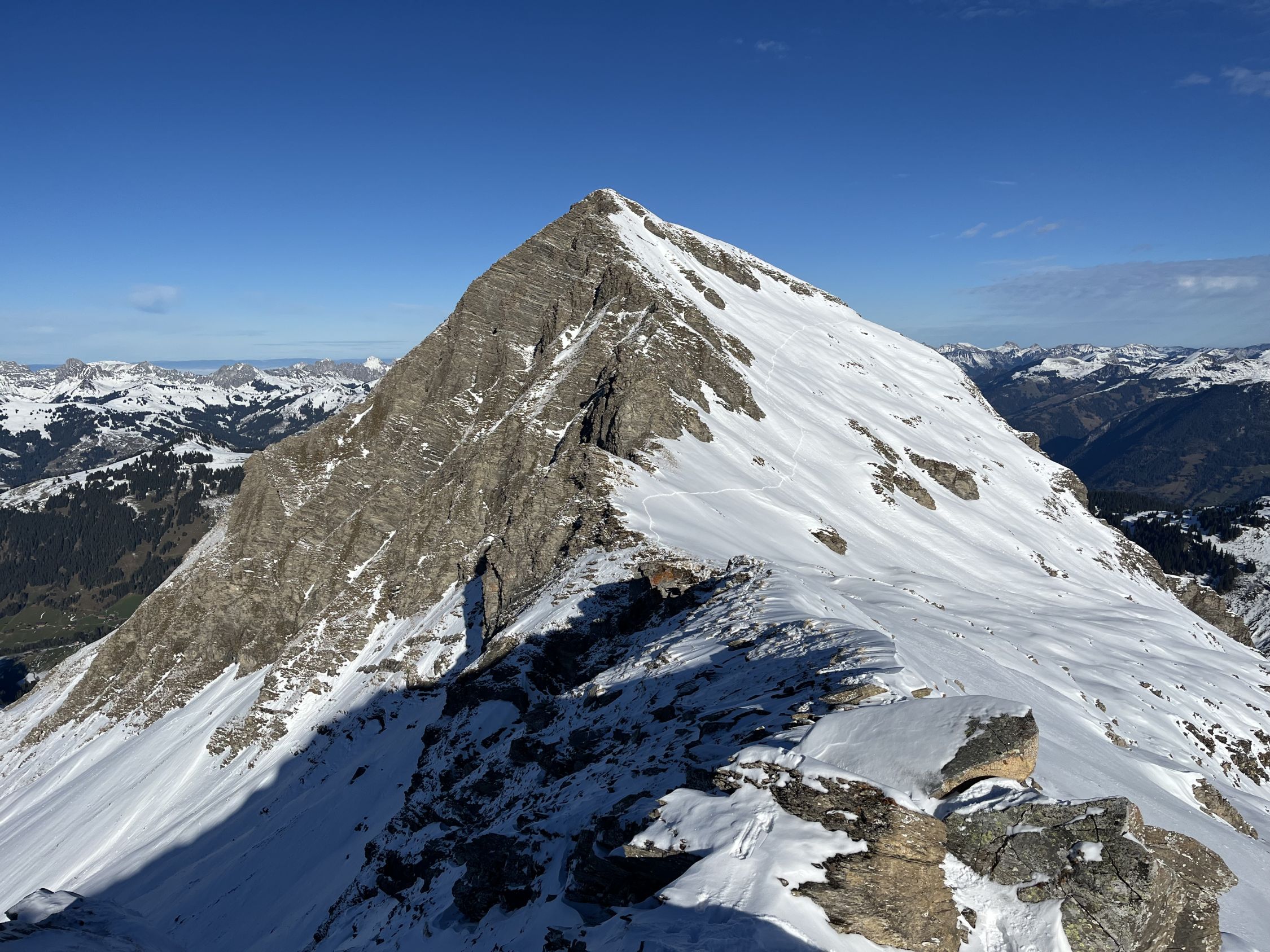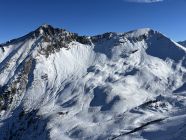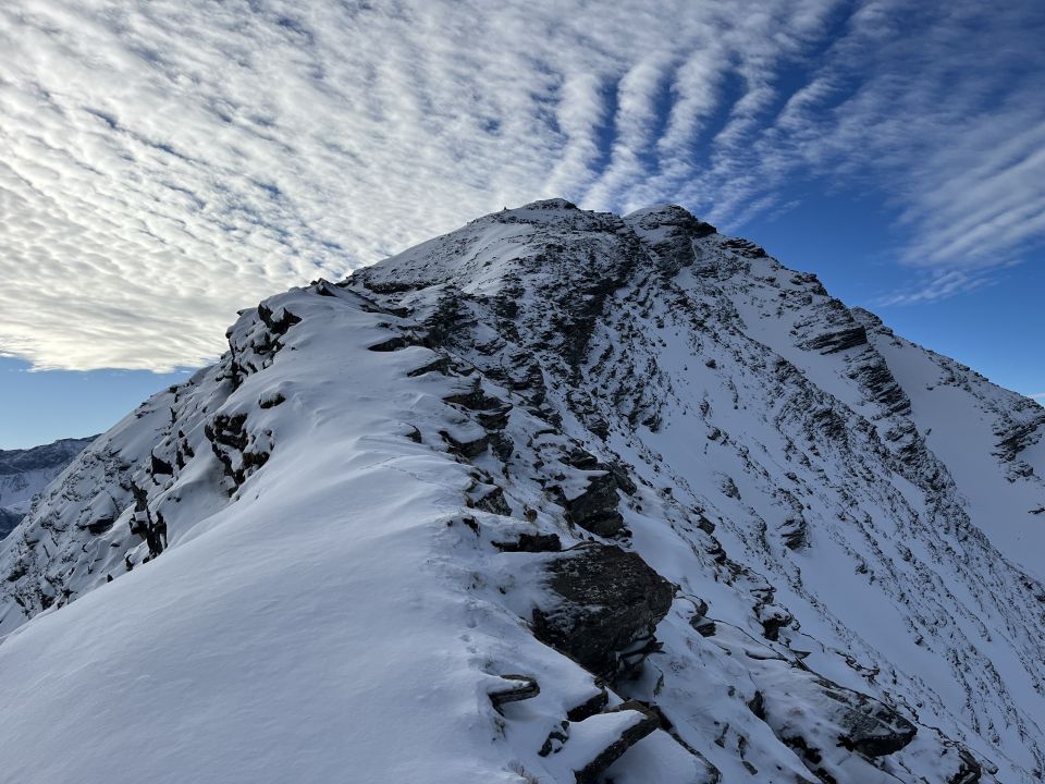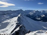 Gut für Schneeschuhe, für Ski wär‘s ungünstig. Die Schneeschuhe kamen durchgehend zum Einsatz, auch wenn es auf dem Grat öfters auf den Felsen kratzte. Das Couloir ins Berzgummloch weist noch zu wenig Schnee auf.