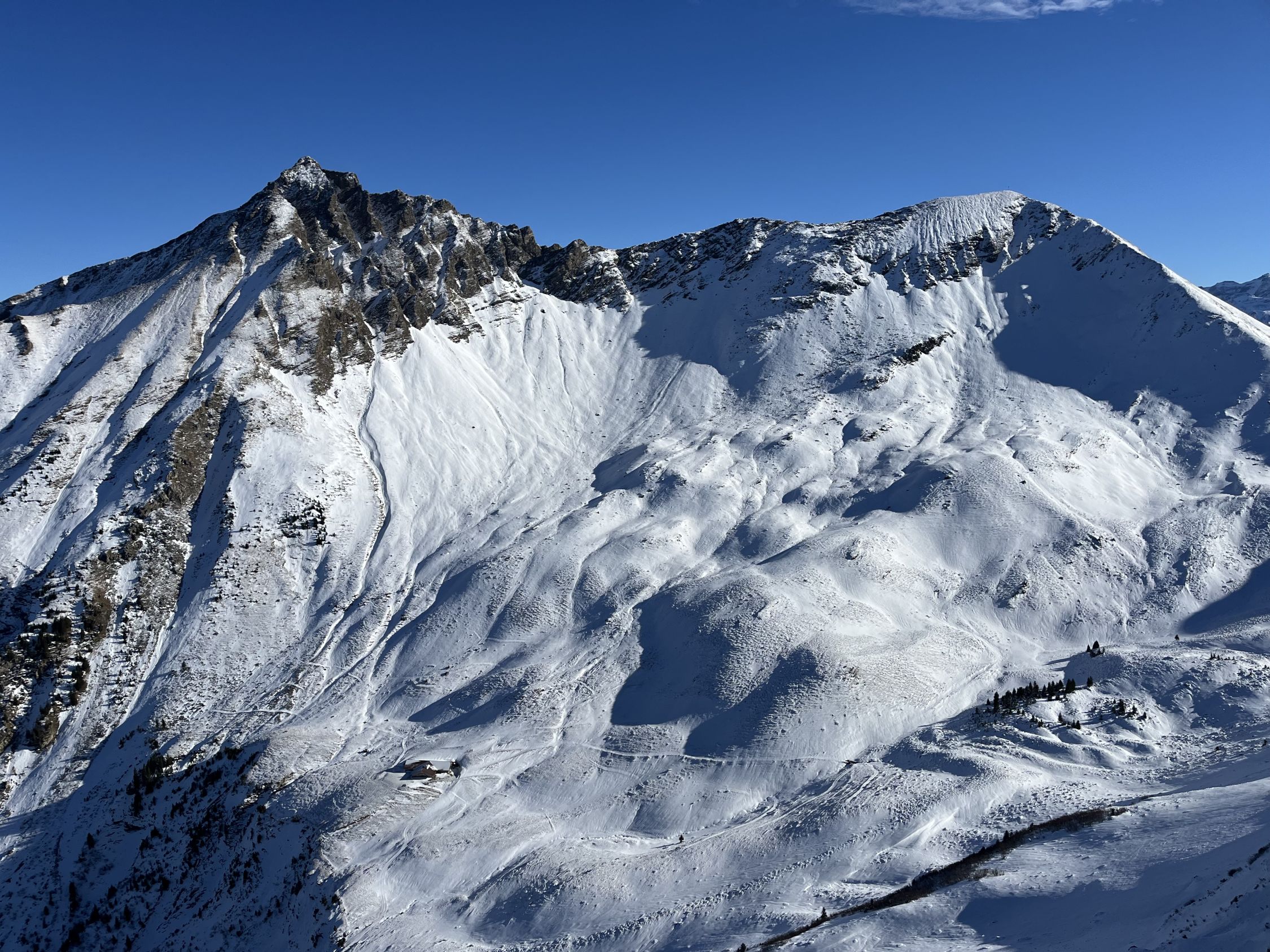 Schneelage: Nordseitig tragende Regenkruste mit minimal Neuschnee drauf, Ostseiten aufgeweicht, Südseiten fast aper.