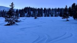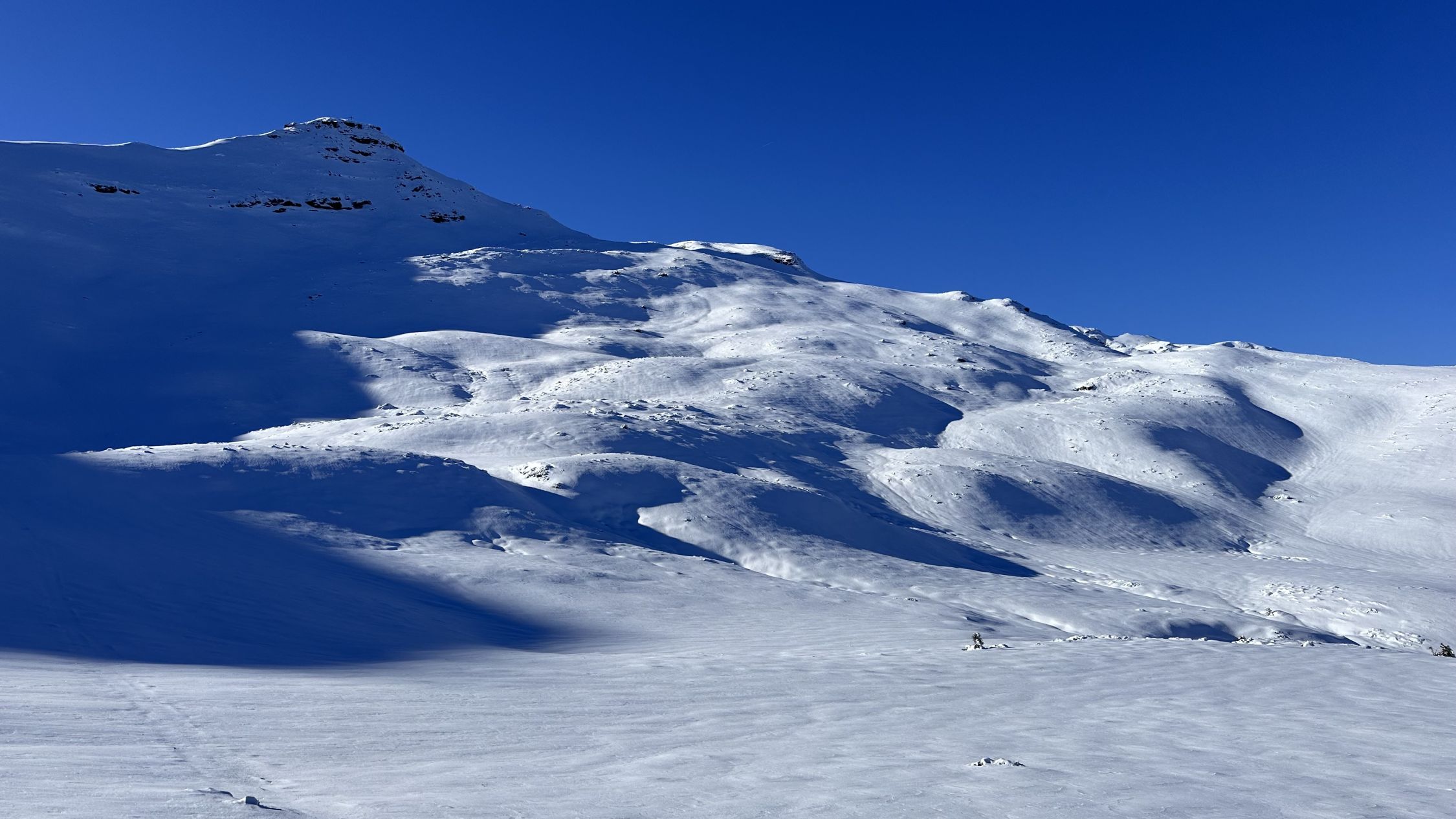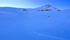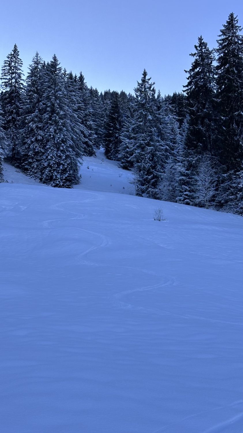 Pulver von oben bis unten, nur nicht so viel wie erwartet (oben 10, unten 5cm), auf oben gut, unten knapp tragender Unterlage (mit gutem Gewicht-Skibreite-Verhältnis und gefühlvollem Fahren tiptop)