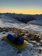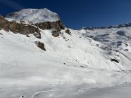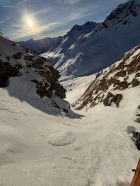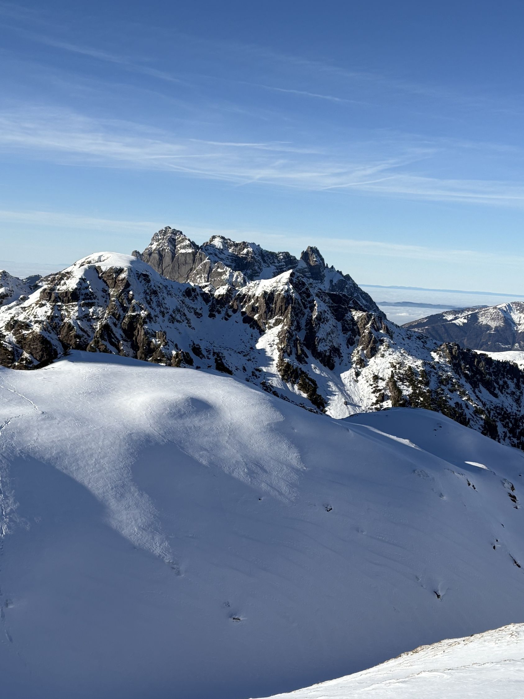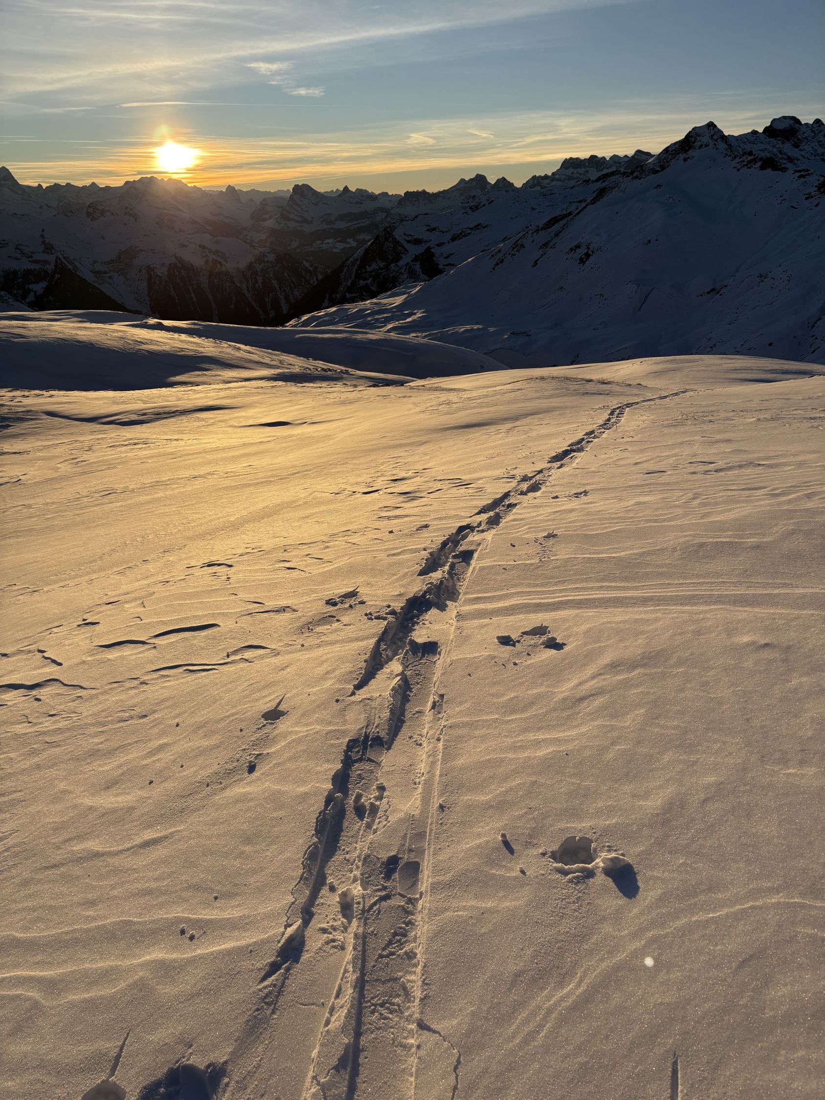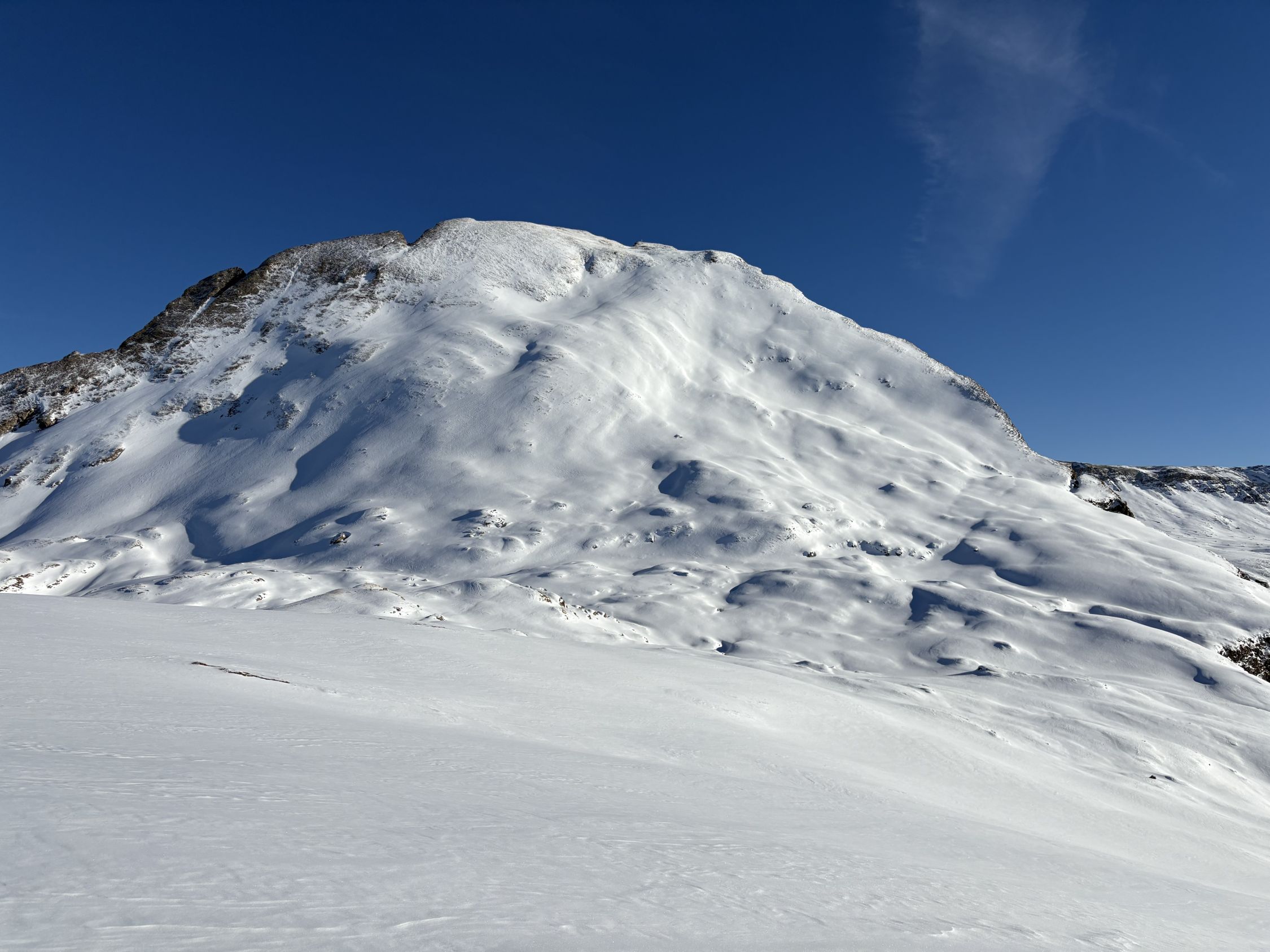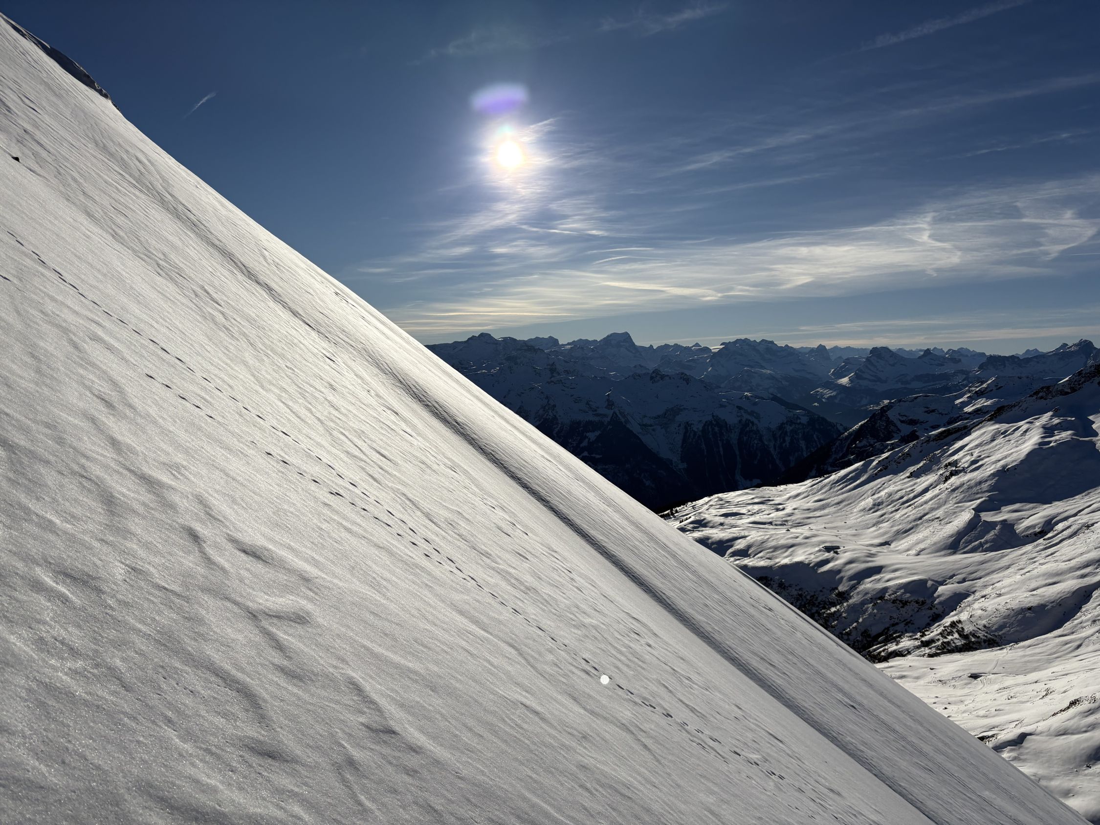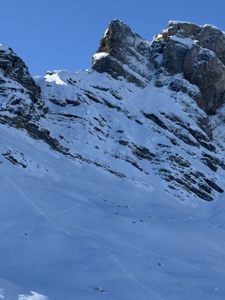 Nicht viel Schnee, aber passend in den Mulden. Pulverschnee und ab und zu etwas Kruste, aber eher selten. Gipfelhang ist steil und benötigt gute Verhältnisse. Wegen Naturschutzgebiet, nur noch via Guetental möglich. Abfahrt vom Gipfel nahm ich die Steilrinne bei 2260m.