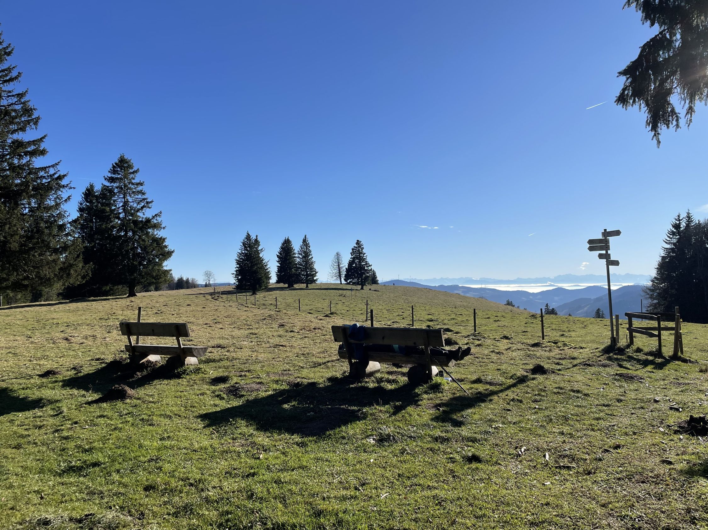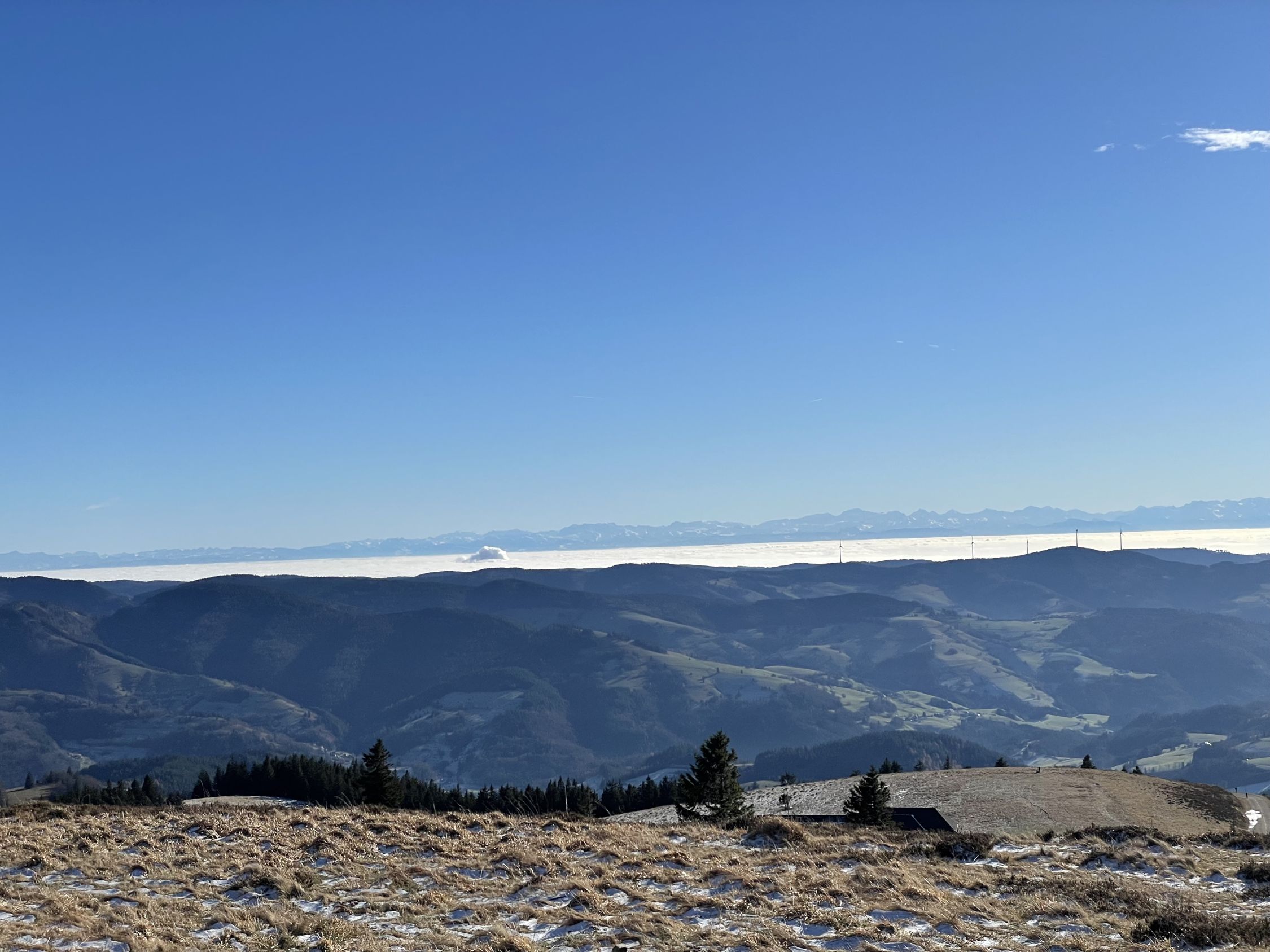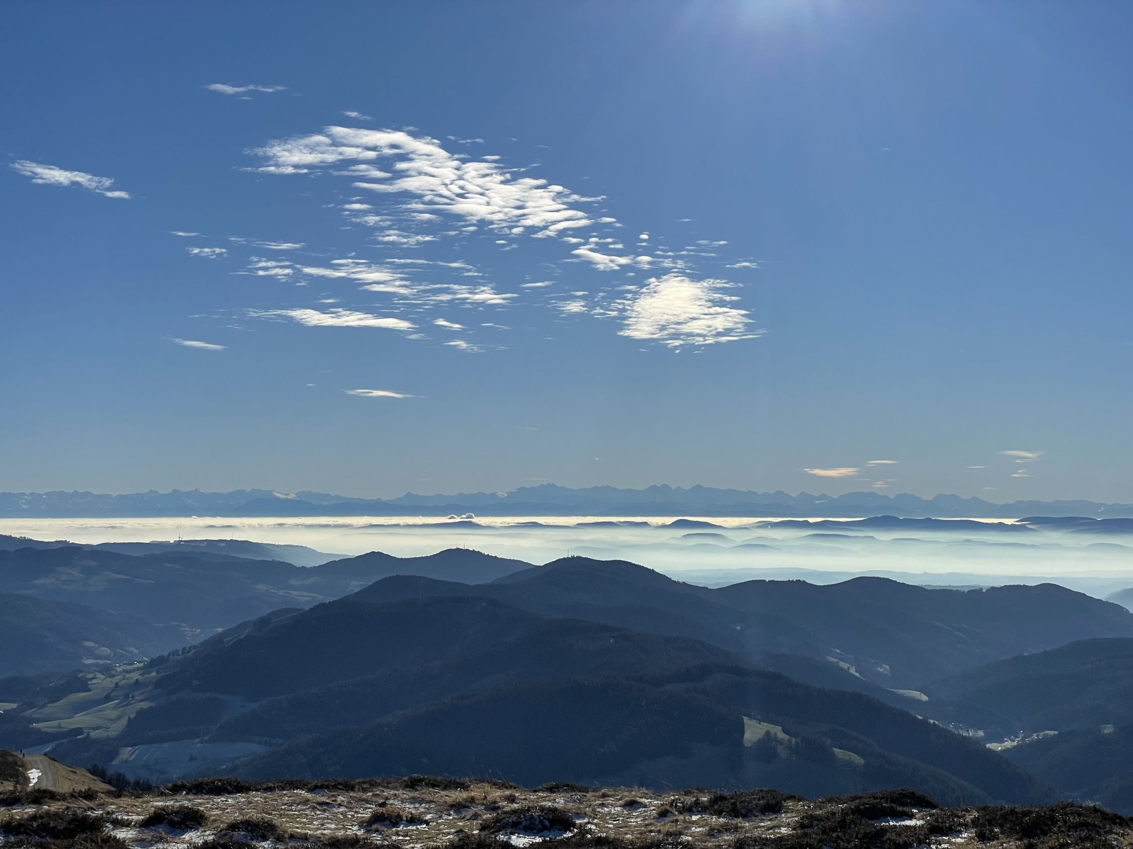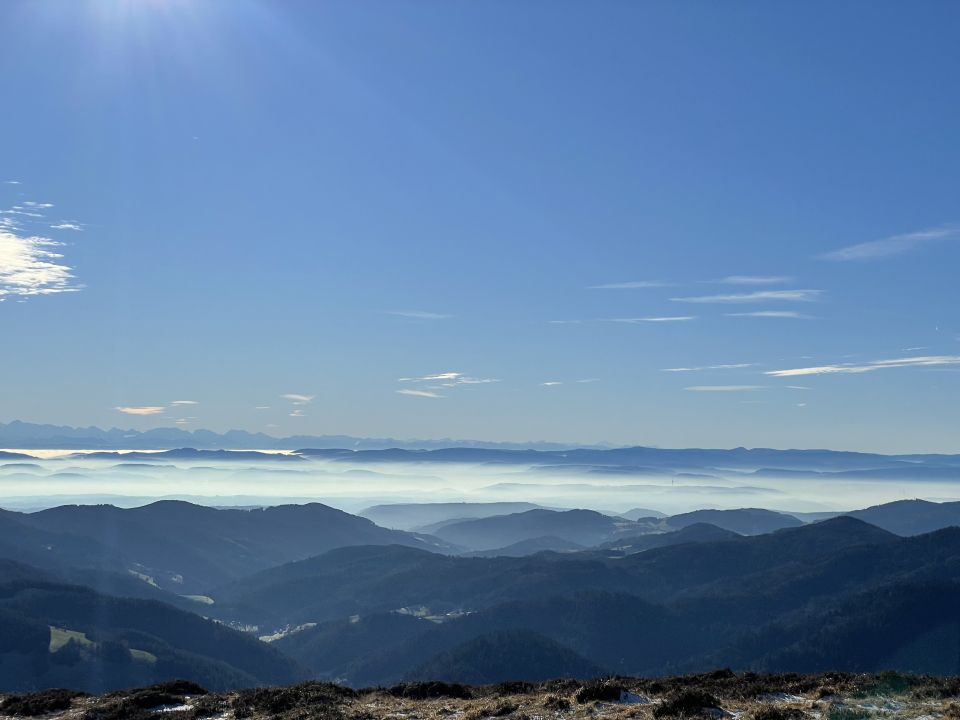 Glanzwetter und beste Wanderverhältnisse. Die Bahn war zu meinem Vergnügen geschlossen, weshalb auch der Ansturm auf den Gipfel ausblieb. Fabelhafte Alpensicht vom Montblanc bis über den Säntis hinaus nach Österreich. Temperatur unten kälter als oben.