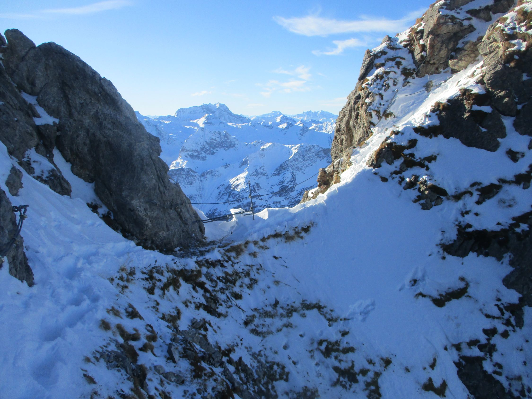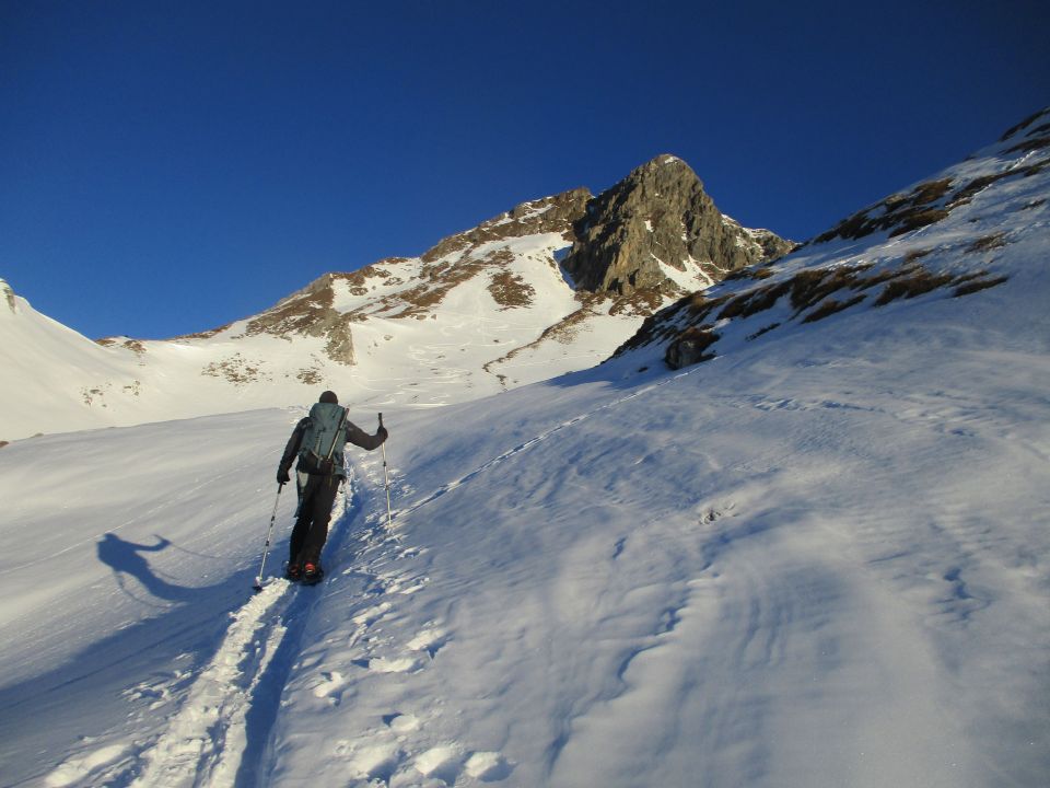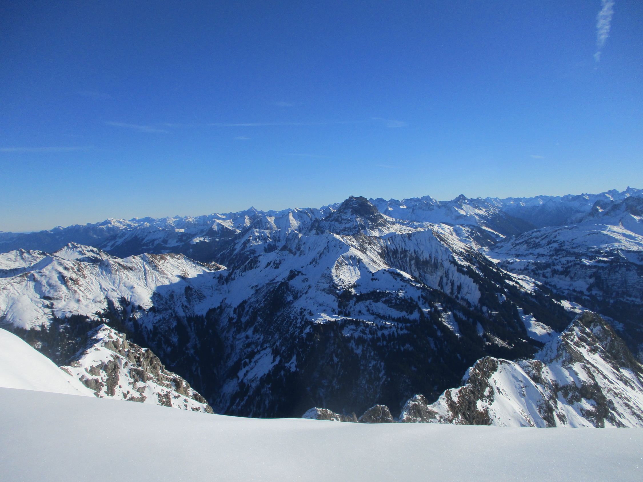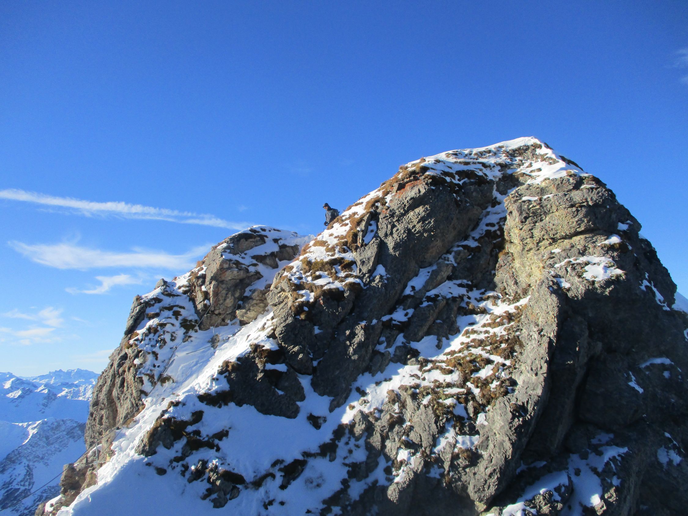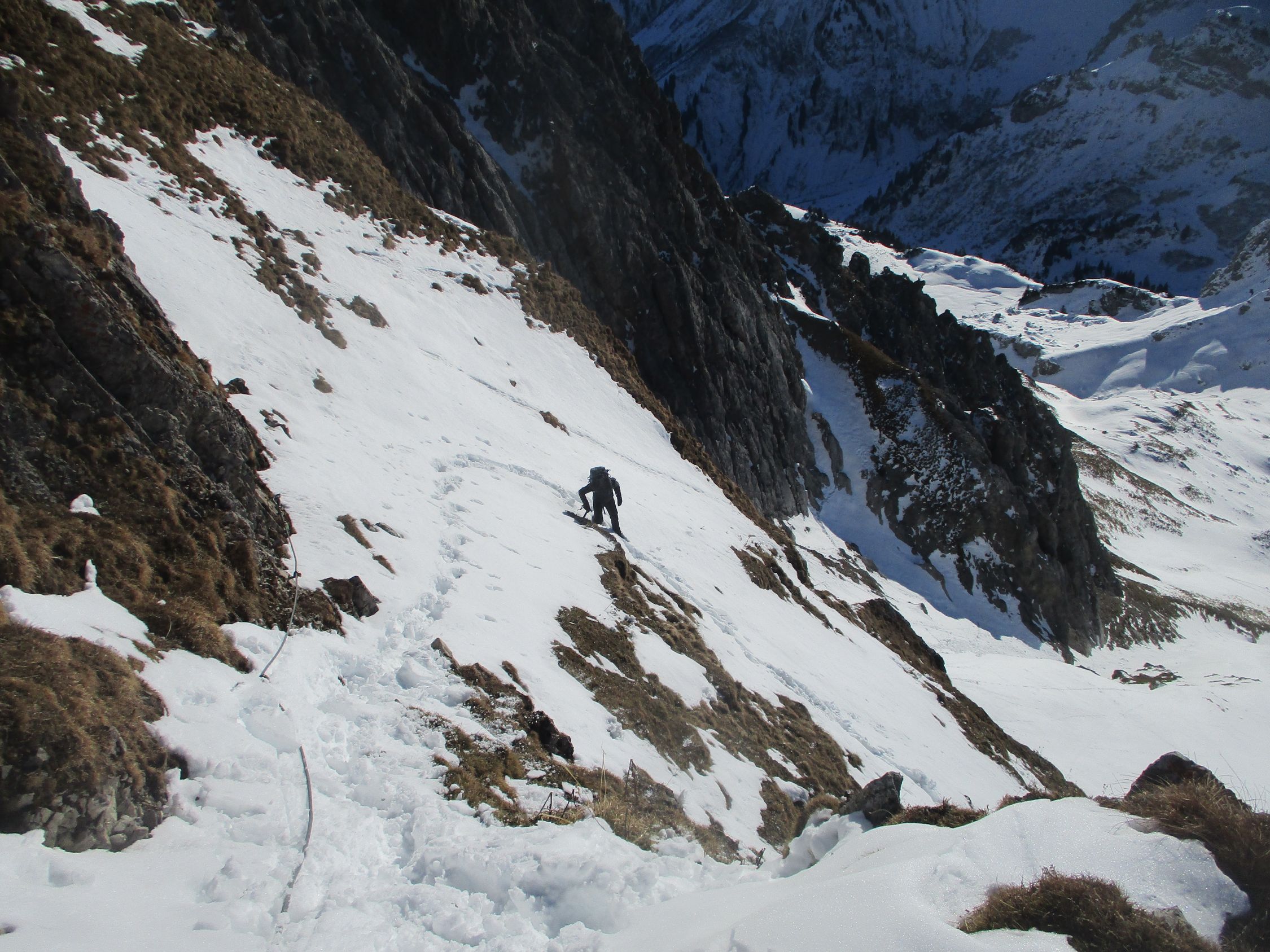 Einsame Tour bei Traumwetter von der Biberacher Hütte aus. Für Skier derzeit aufgrund zu geringer Schneemengen nicht geeignet, wenngleich eine fragmentierte Skispur am Vortag gelegt worden war, von der wir im Aufstieg profitieren konnten. Es war ersichtlich, dass unsere Vorgänger bereits früh mühsam zu Fuß weitergestiegen sind.