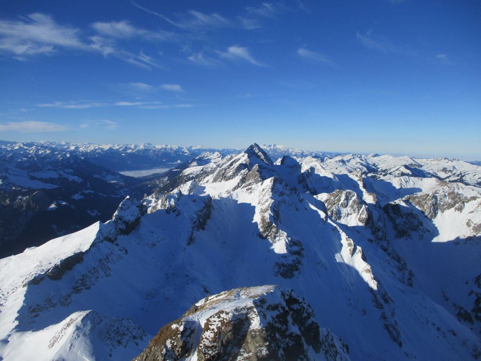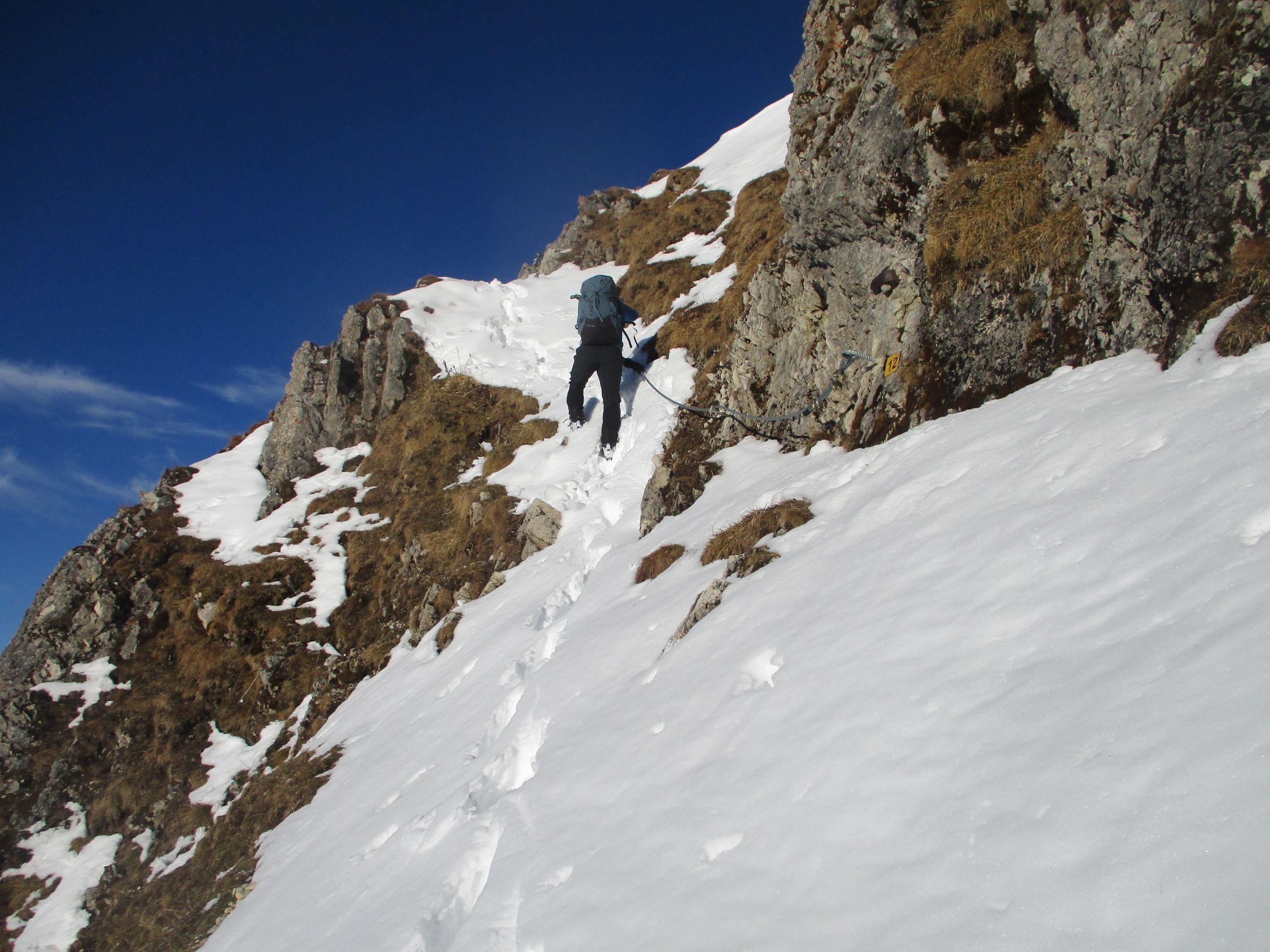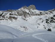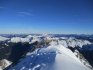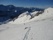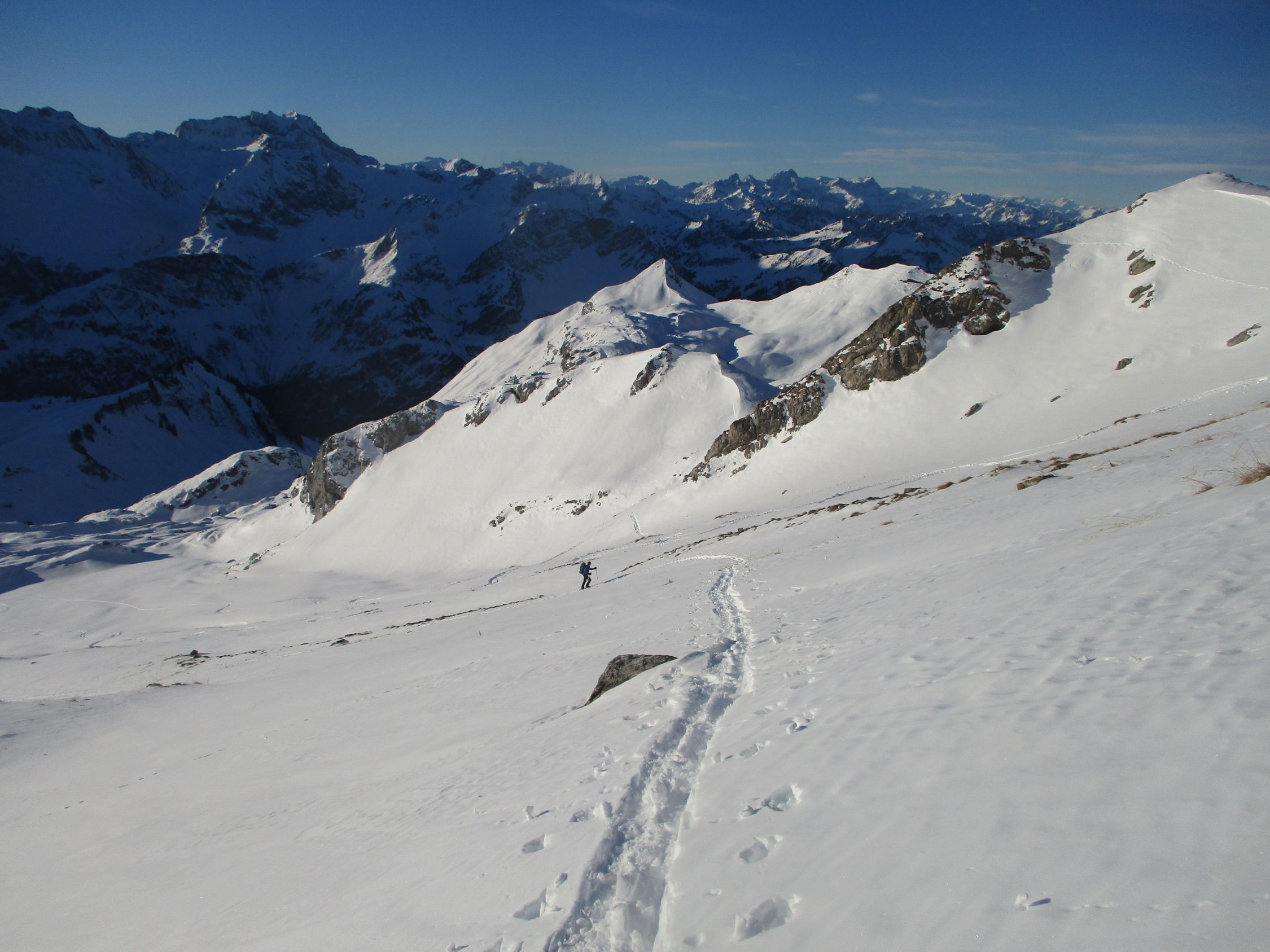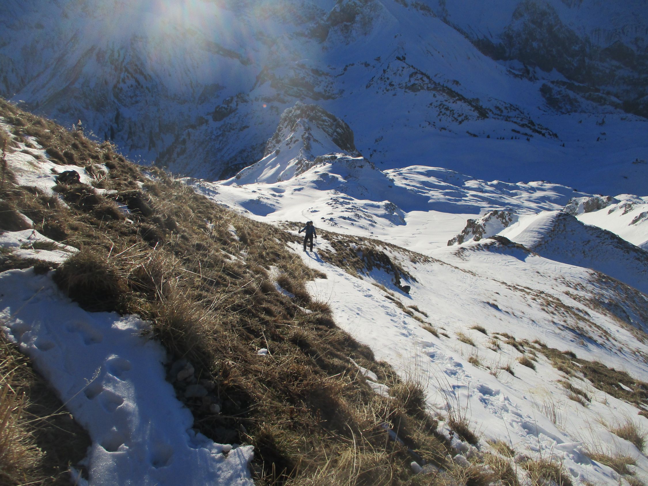 Einsame Tour bei Traumwetter von der Biberacher Hütte aus. Für Skier derzeit aufgrund zu geringer Schneemengen nicht geeignet, wenngleich eine fragmentierte Skispur am Vortag gelegt worden war, von der wir im Aufstieg profitieren konnten. Es war ersichtlich, dass unsere Vorgänger bereits früh mühsam zu Fuß weitergestiegen sind.