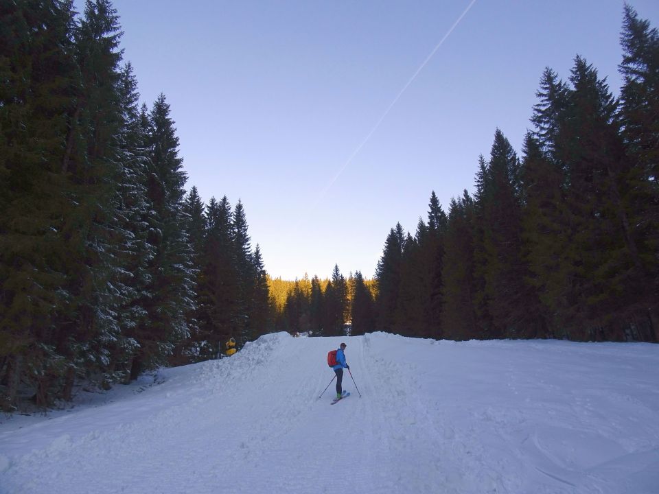 Schneelage recht gut, wenn auch nicht üppig. Aufstieg zur Ifenhütte auf dem Ziehweg hart, aber griffig. Pisten in Vorbereitung und gute Grundlage. Direkt in der Ratrac-Spur allerdings nicht glatt präpariert und ruppig, nebendran aber meist schön zu fahren (tragend mit etwas Schneeauflage).