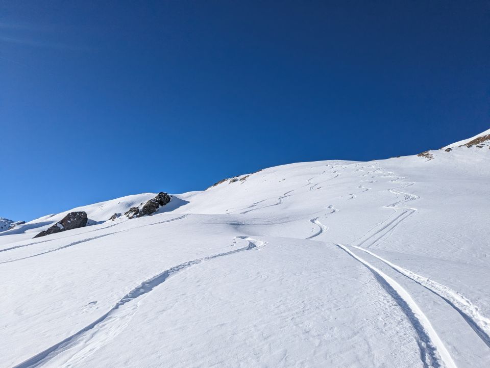 Bei den aktuellen Verhältnissen lohnt sich die Überschreiung zum Hauptgipfel sehr. Von hier kann auch abgefahren werden in unverspurtem Gelände (3 alte Spuren vs. komplett zerfahren am Normalweg). Vom Hauptgipfel abgefahren links halten und ein für einen kurzen Gegananstieg (50hm) wieder auffellen.