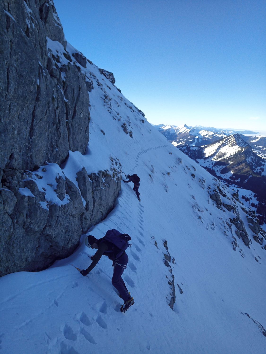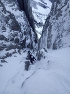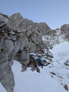 Gute bis sehr gute Verhältnisse im Südwestkamin resp. Südwestcouloir. Die Umgehung des Kamins am Start ist Schneefrei, die Traverse ins Hauptcouloir mit Trittschnee und im Couloir wechseln sich Firn und Trittschnee ab. Erst im oberen, schattigeren Teil, wird der Schnee etwas weicher. Der Ausstieg auf den Gipfel wiederum ist problemlos machbar.