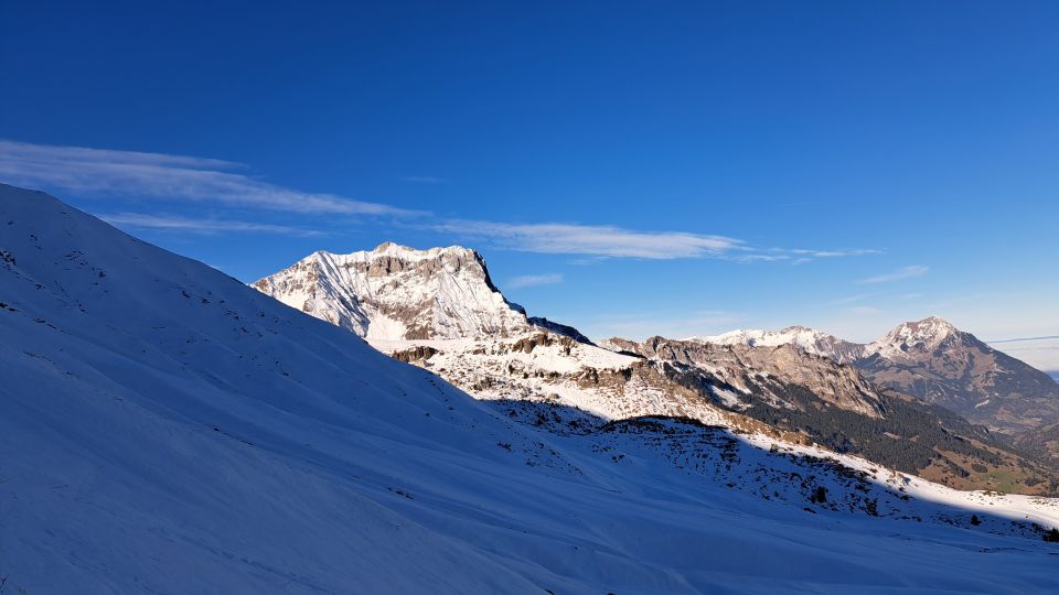 Zuoberst in den nördlichen Expositionen Pulverschnee, teilweise auch Triebschnee. Nicht allzu viel, und die Steine lauern darunter - aber es reicht für die ersten Schwünge der Saison. Neuschneegenuss mit Altskiern. Südseitig liegt bis auf Höhe des Gipfels sehr wenig Schnee.