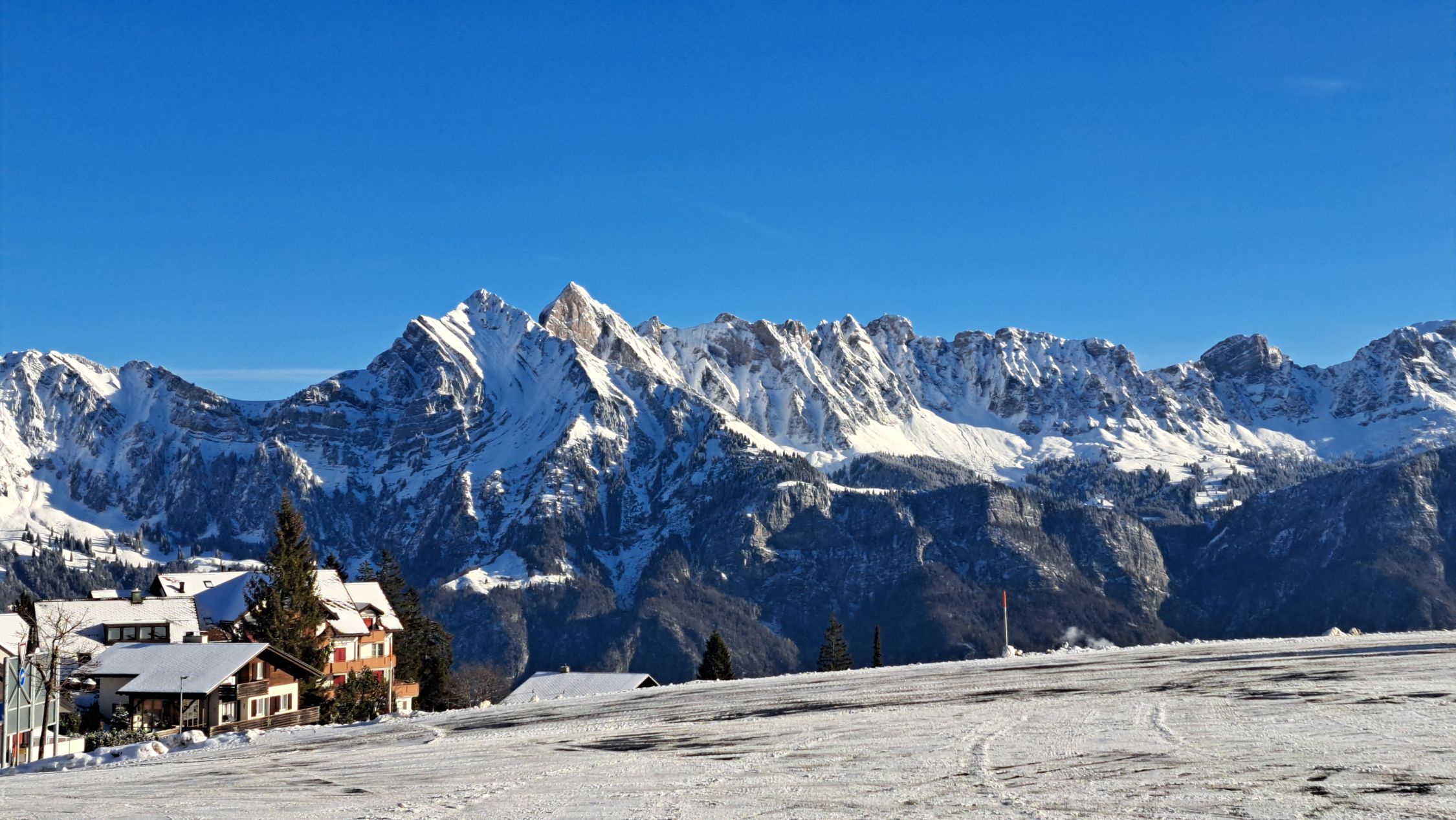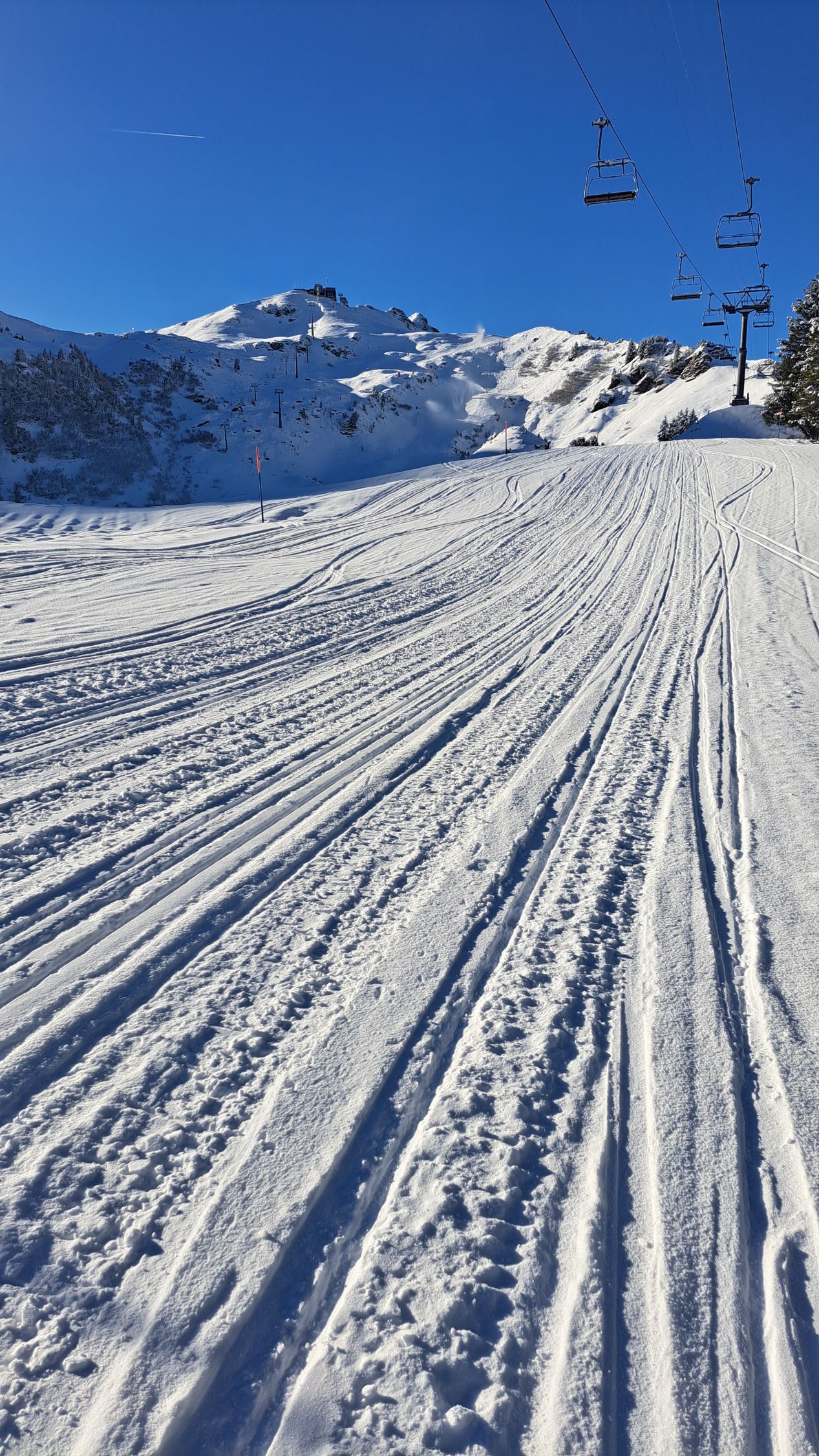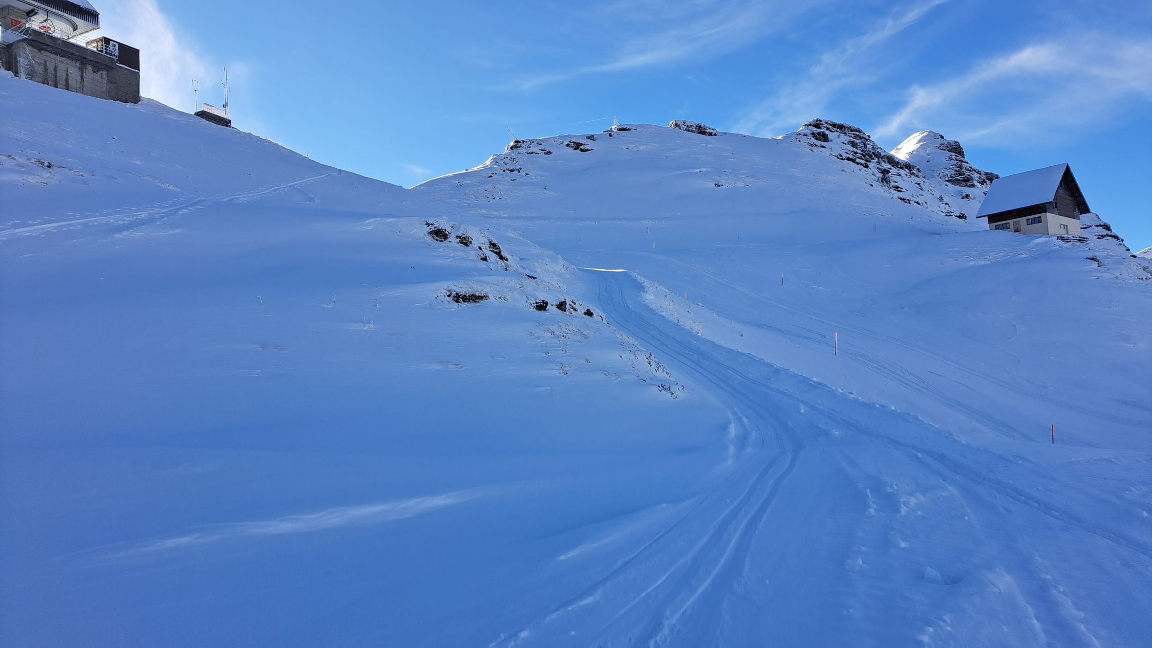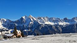 Dank der Schneekanonen vom Parkplatz Tannenbodenalp bis hoch zum Maschgenkamm schöne Verhältnisse auf der Piste.