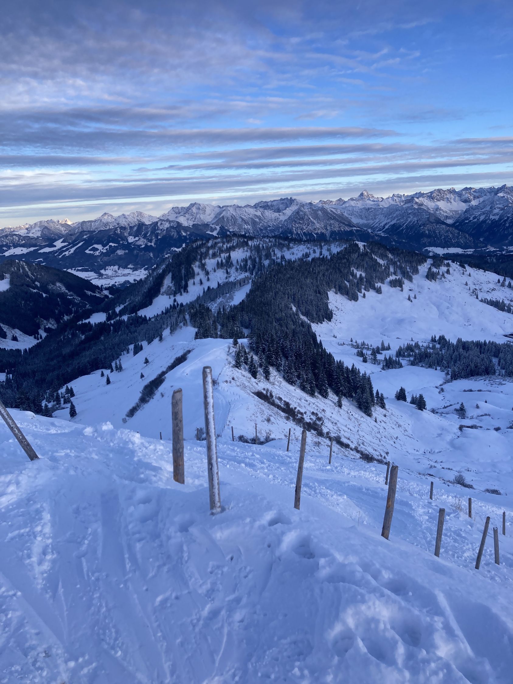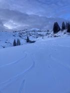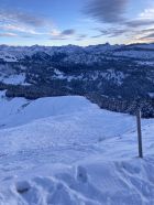 Am Abend beim Rückweg noch den Kopf gelüftet. Leichte Pulverdecke auf dünner, aber fester Altschneedecke. Der Weg über den Sattel hoch ist überall knapp mit Schnee bedeckt. Runter nach rechts zum Skilift einige schöne Hänge.